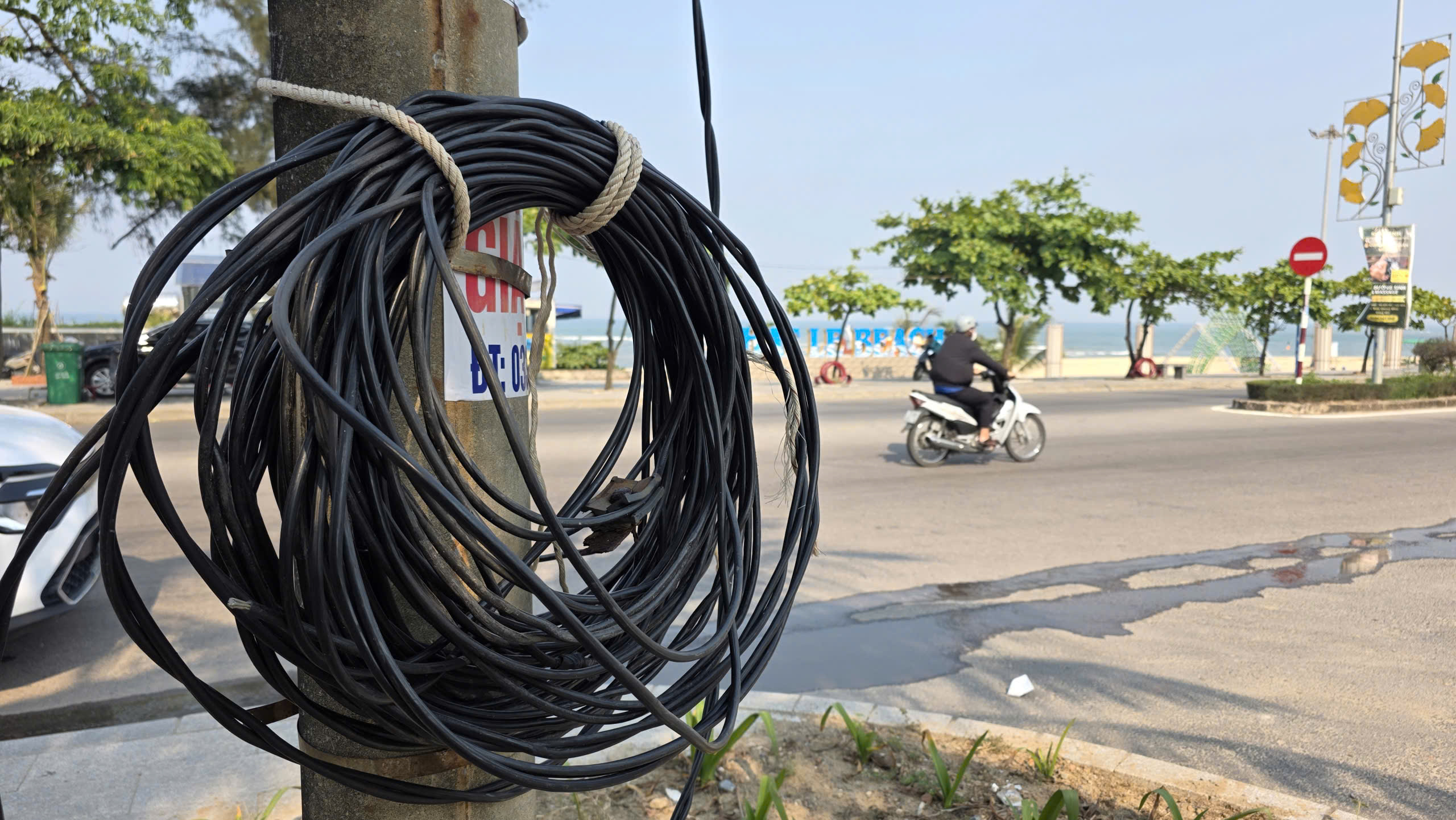 Dây điện được xác định là do người dân tự ý kéo qua đường, gây ra vụ tai nạn. Ảnh: MINH TRƯỜNG.