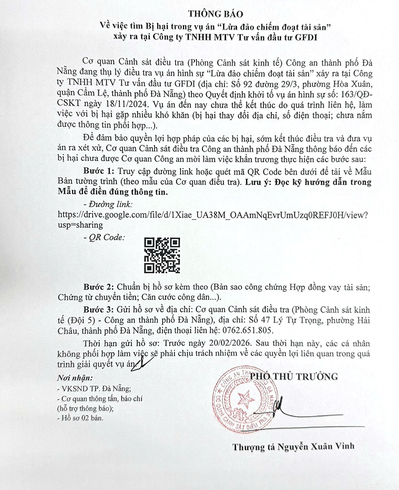 Công an Đà Nẵng cho biết cơ quan cảnh sát điều tra đang thụ lý vụ án lừa đảo chiếm đoạt tài sản liên quan đến Công ty TNHH MTV Tư vấn đầu tư GFDI. Tuy nhiên, quá trình điều tra gặp khó khăn do một số bị hại đã thay đổi nơi cư trú, số điện thoại hoặc chưa xác định được thông tin liên lạc.