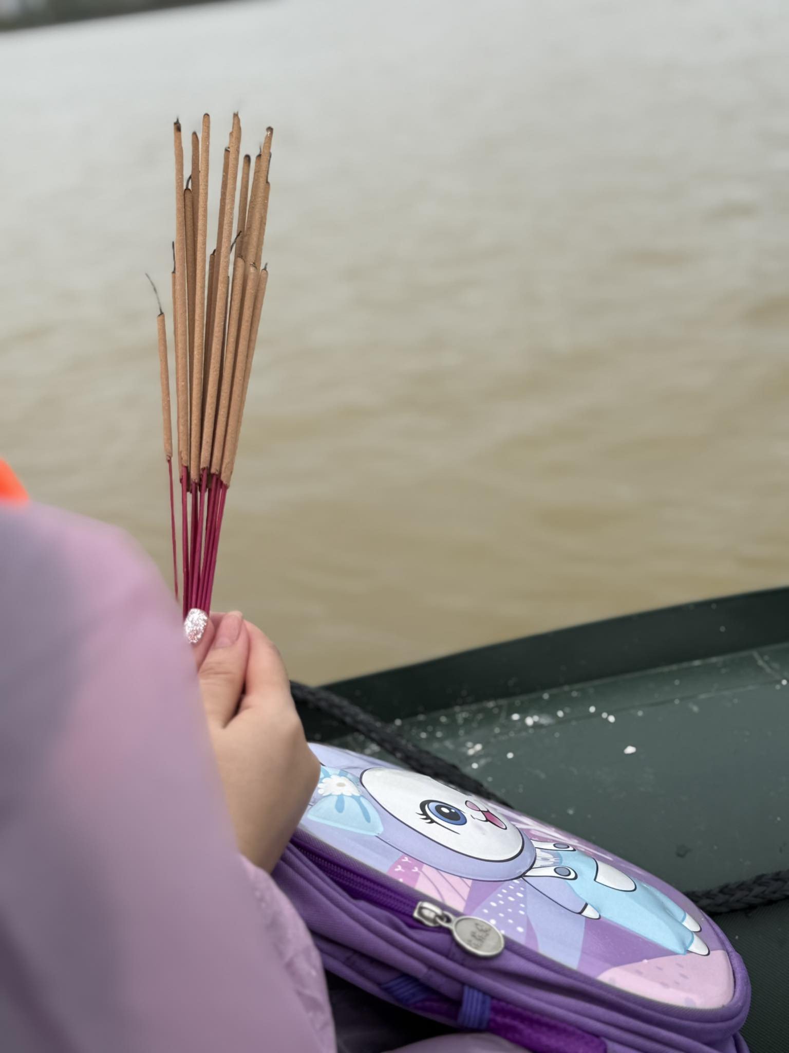 Hình ảnh chị Y. cầm hương, mang theo đồ dùng của con ngồi trên thuyền tìm kiếm 3 bố con. Ảnh: DNQ