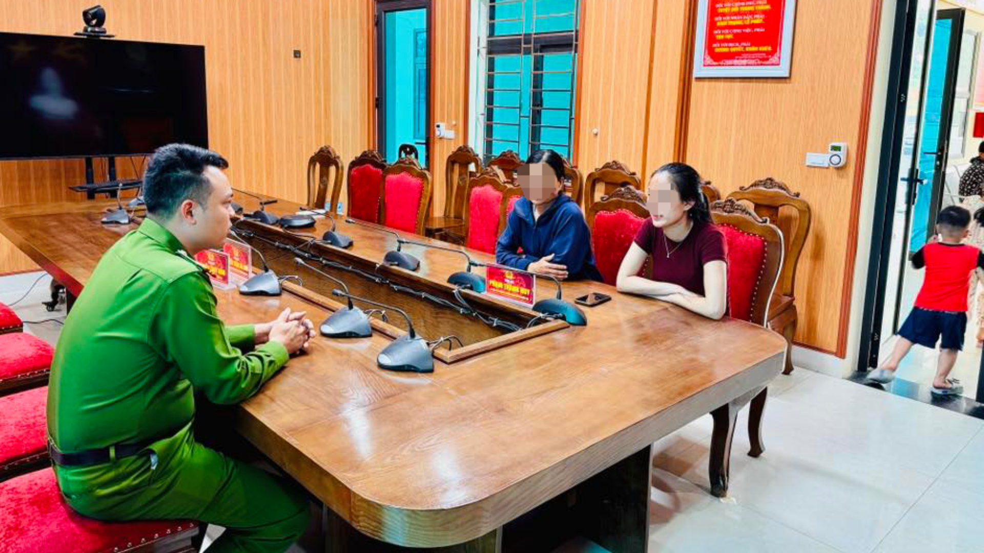 Trưởng Công an xã Nghĩa Trụ làm việc với chị T (ngồi ngoài, bên phải).