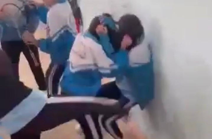 Em T. bị 2 học sinh cùng lớp đánh, đạp ngay trong khuôn viên nhà trường. Ảnh cắt từ Clip
