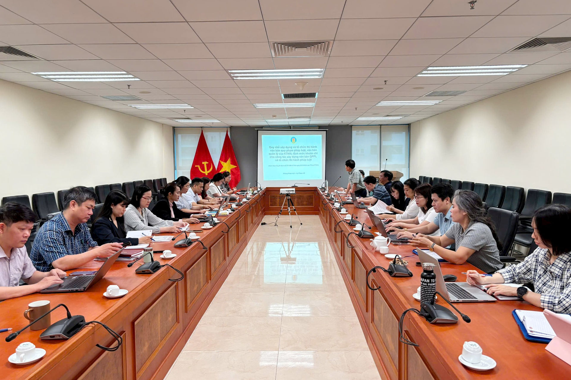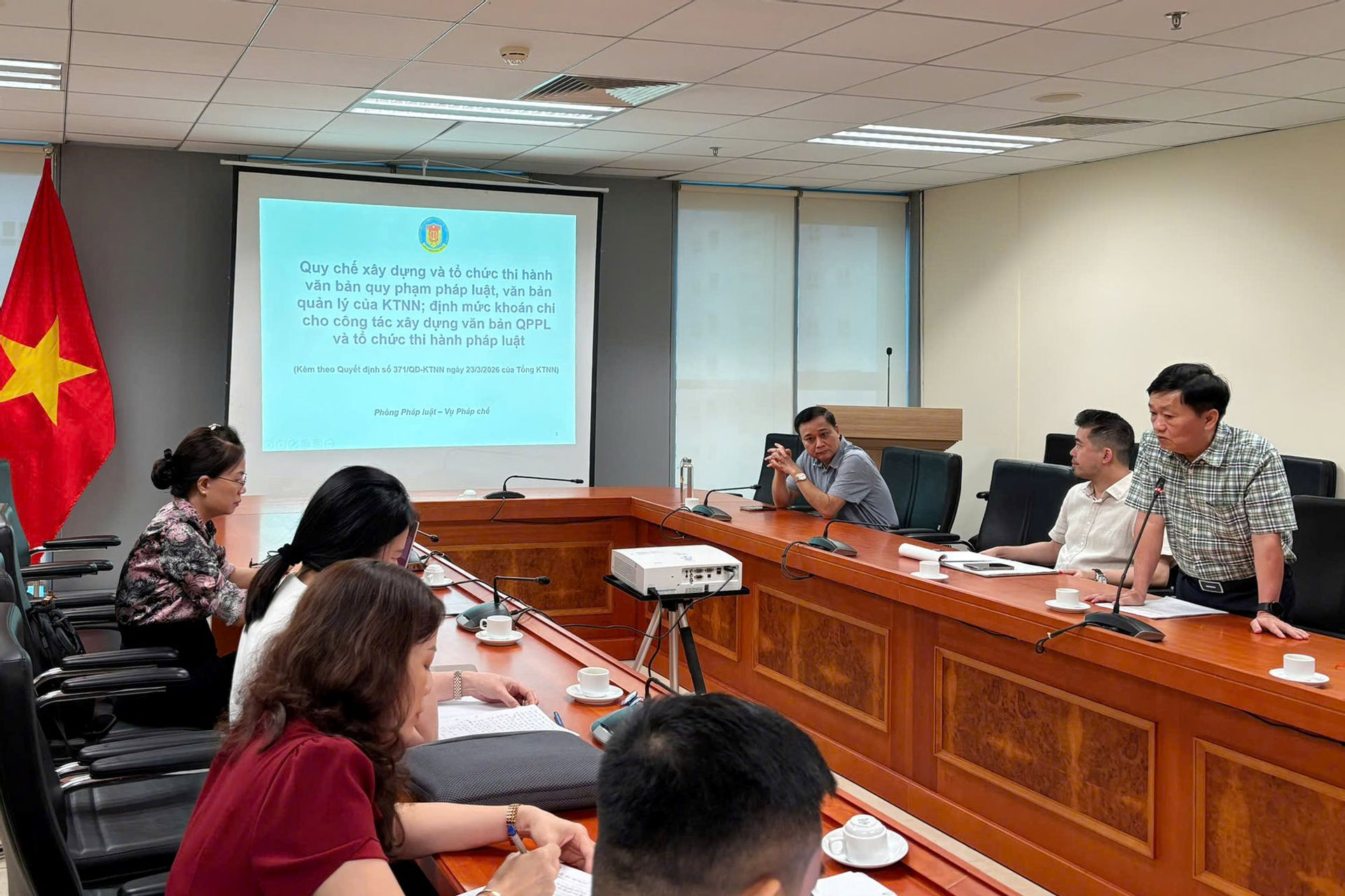 Tại chương trình, bà Bùi Thanh Thủy - Phó Trưởng phòng Pháp luật - đã trực tiếp truyền đạt, phân tích những nội dung cốt lõi của Quyết định số 371/QĐ-KTNN gắn với thực tiễn hoạt động chuyên môn của đơn vị. Công chức tham dự đã tích cực trao đổi, thảo luận các vấn đề chuyên sâu, trong đó tập trung làm rõ các nội dung: các khái niệm trong công tác xây dựng và tổ chức thi hành pháp luật (kiểm tra VBQPPL, hệ thống hóa, pháp điển, hợp nhất văn bản); quy trình soạn thảo VBQPPL, VBQL; thể thức, kỹ thuật trình bày văn bản; công tác thẩm định và cấu trúc Báo cáo thẩm định; công tác pháp điển, hợp nhất, hệ thống hóa VBQPPL; cũng như việc thanh toán, quyết toán kinh phí xây dựng VBQPPL theo quy định tại Nghị định số 289/2025/NĐ-CP.