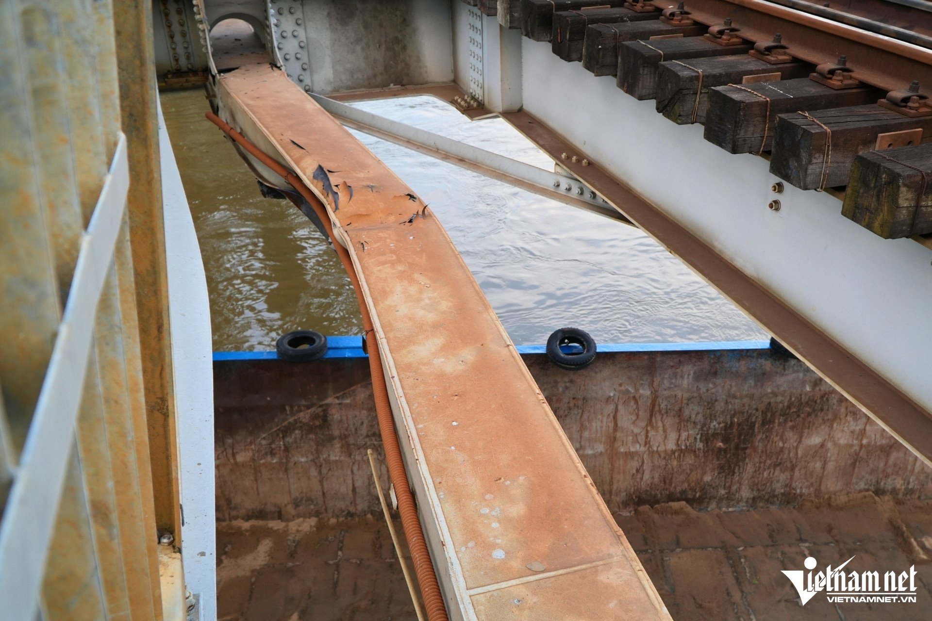 Cú va chạm khiến dầm dọc chạy tàu tại nhịp 2, khoang 5 của cầu bị cong, vênh, đường ray lệch hướng. Mức độ thiệt hại đang được đơn vị đường sắt kiểm tra, giám định.