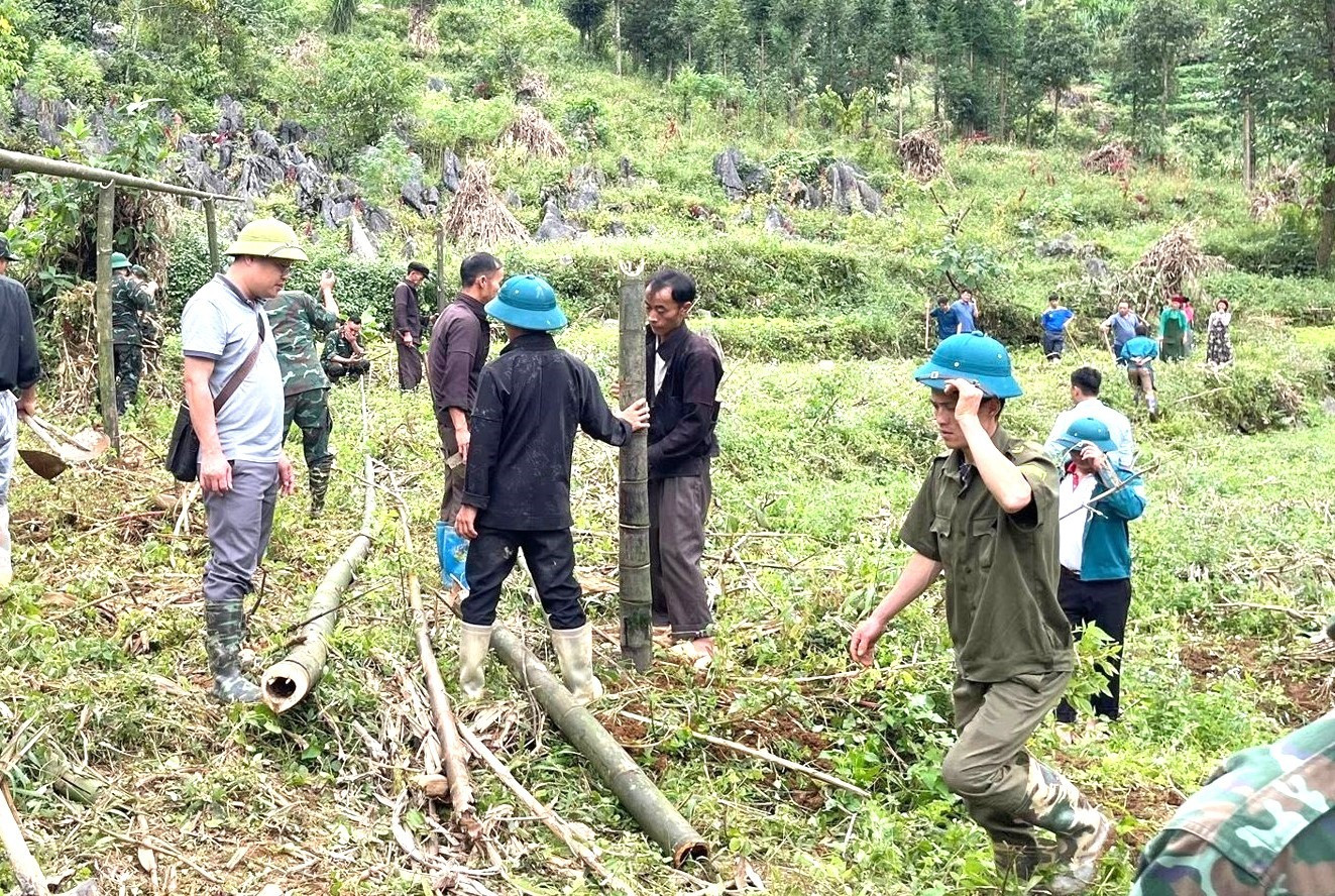 Lực lượng chức năng dựng nhà tạm tránh bão, lũ cho người dân thôn Má Lầu A