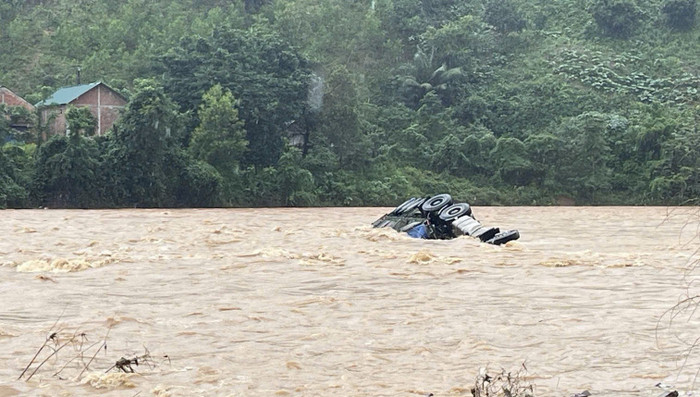 Khi đi qua cầu tràn thôn A Rông Trên (xã La Lay), nước lũ dâng cao và chảy xiết khiến cả người và phương tiện bị cuốn trôi.