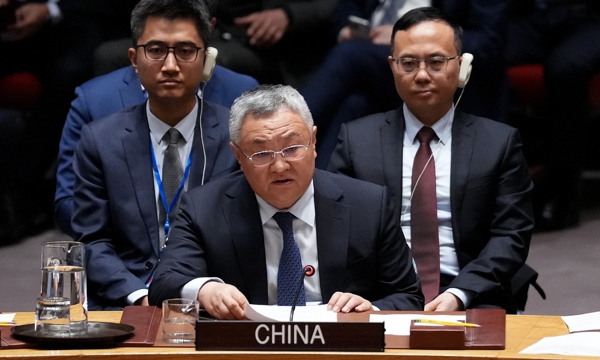 Ông Phó Thông, Đại diện thường trực của Trung Quốc tại Liên hợp quốc phát biểu trong cuộc họp của Hội đồng Bảo an tại New York ngày 28/2. (Ảnh: VCG)