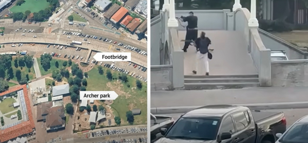 Ảnh chụp màn hình cho thấy hai kẻ xả súng đứng trên cầu cạn (bên phải) bắn xuống bãi biển Bondi. Ảnh: Guardian.