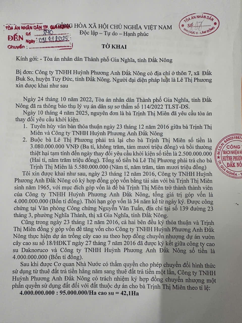 Liên quan đến Công ty TNHH Huỳnh Phương Anh Đắk Nông và dự án trồng chăm sóc cây cao su, TAND Khu vực 6 – Lâm Đồng (trước đây là TAND TP Gia Nghĩa, Đắk Nông) đang thụ lý vụ án dân sự “Tranh chấp hợp đồng góp vốn” giữa công ty này và bà Trịnh Thị Miên (phường Thống Nhất, tỉnh Gia Lai).