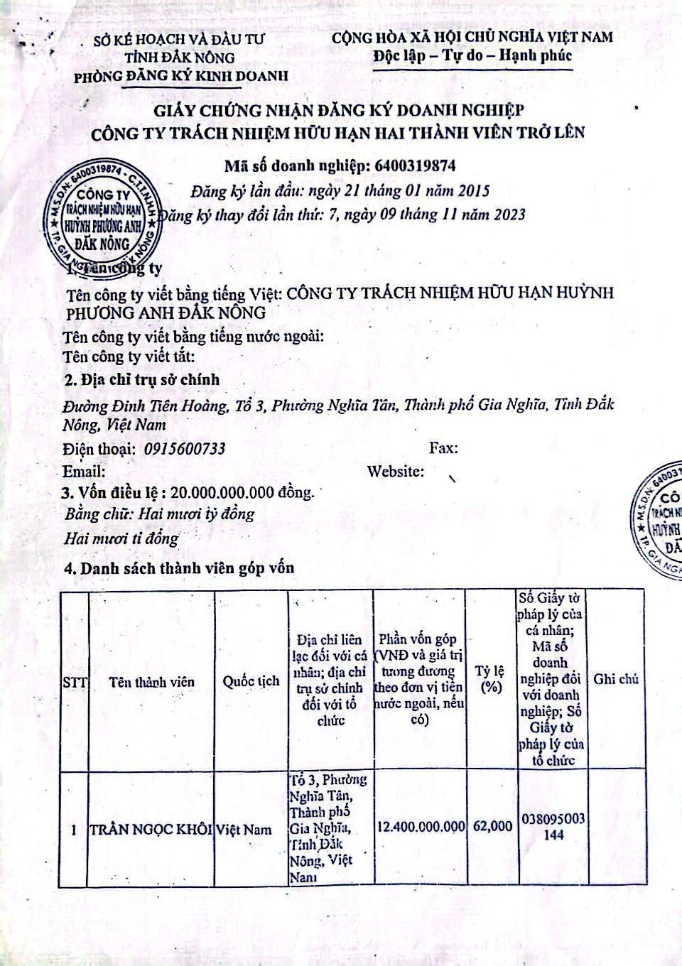 Đặc biệt, theo bà Miên, việc coi thường pháp luật của bà Lê Thị Phương thể hiện rõ qua đối chiếu hồ sơ pháp lý. Cụ thể, Kết luận thanh tra số 76 ngày 27/6/2025 xác định, tại lần đăng ký thay đổi thứ 7 (9/11/2023), người đại diện theo pháp luật của Công ty TNHH Huỳnh Phương Anh Đắk Nông là ông Trần Ngọc Khôi (con trai bà Phương). Tuy nhiên, trong tờ khai đề ngày 6/6/2025 gửi tòa án, bà Phương lại trực tiếp ký tên, đóng dấu với tư cách người đại diện theo pháp luật của công ty.