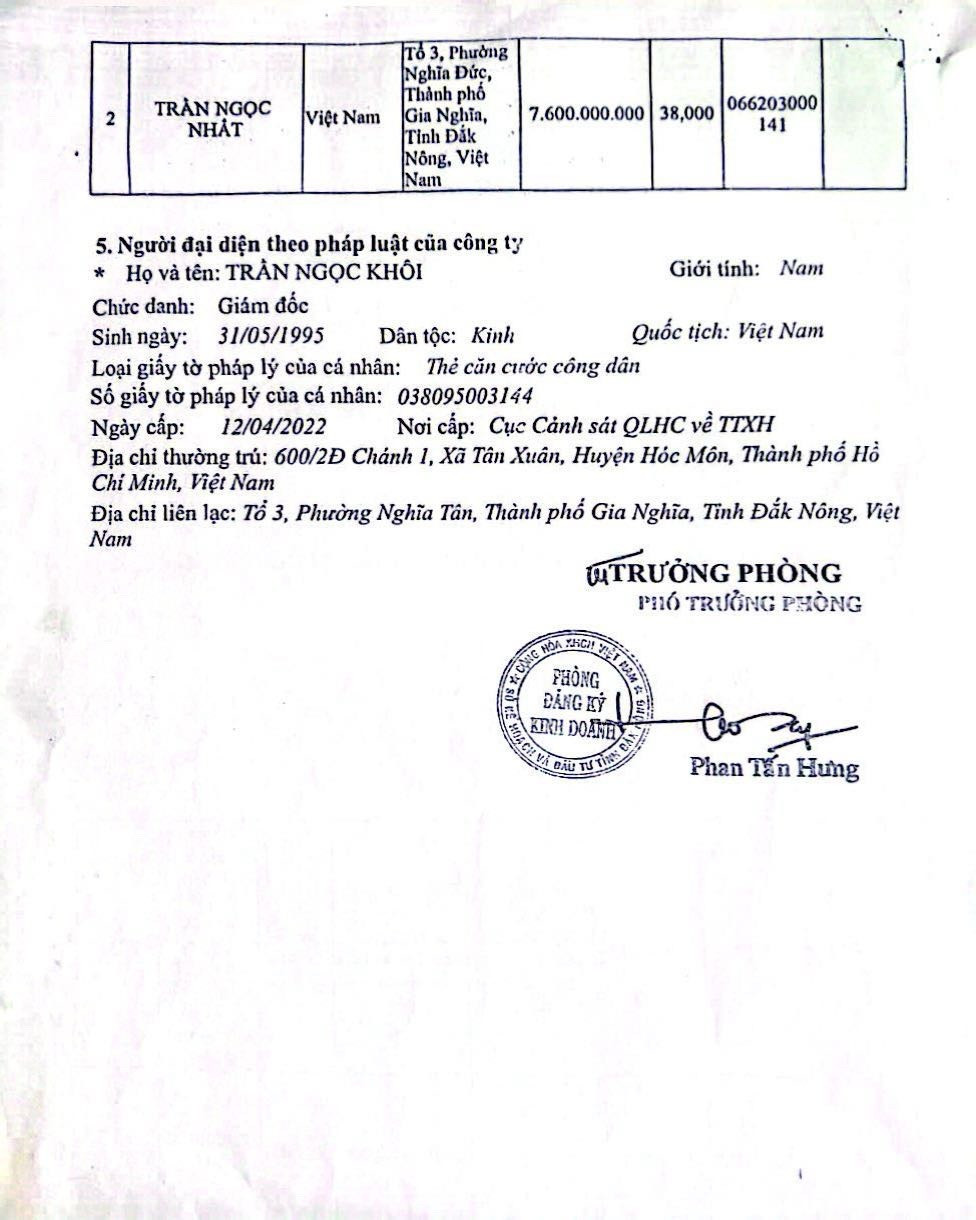 Theo Giấy chứng nhận đăng ký doanh nghiệp thay đổi lần thứ 7, ông Trần Ngọc Khôi là người đại diện pháp luật, nhưng Tờ khai gửi tới tòa án lại ghi bà Lê Thị Phương.