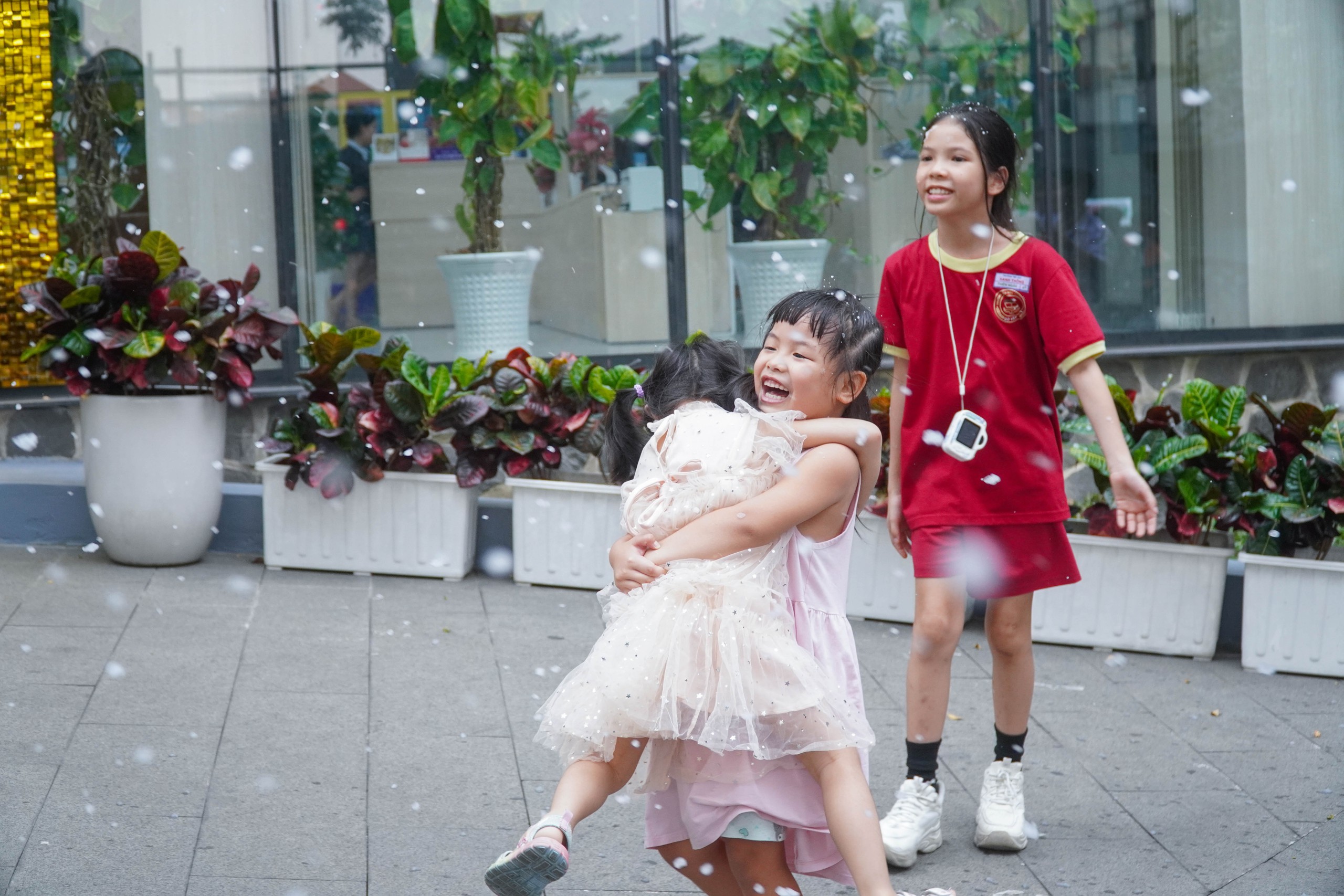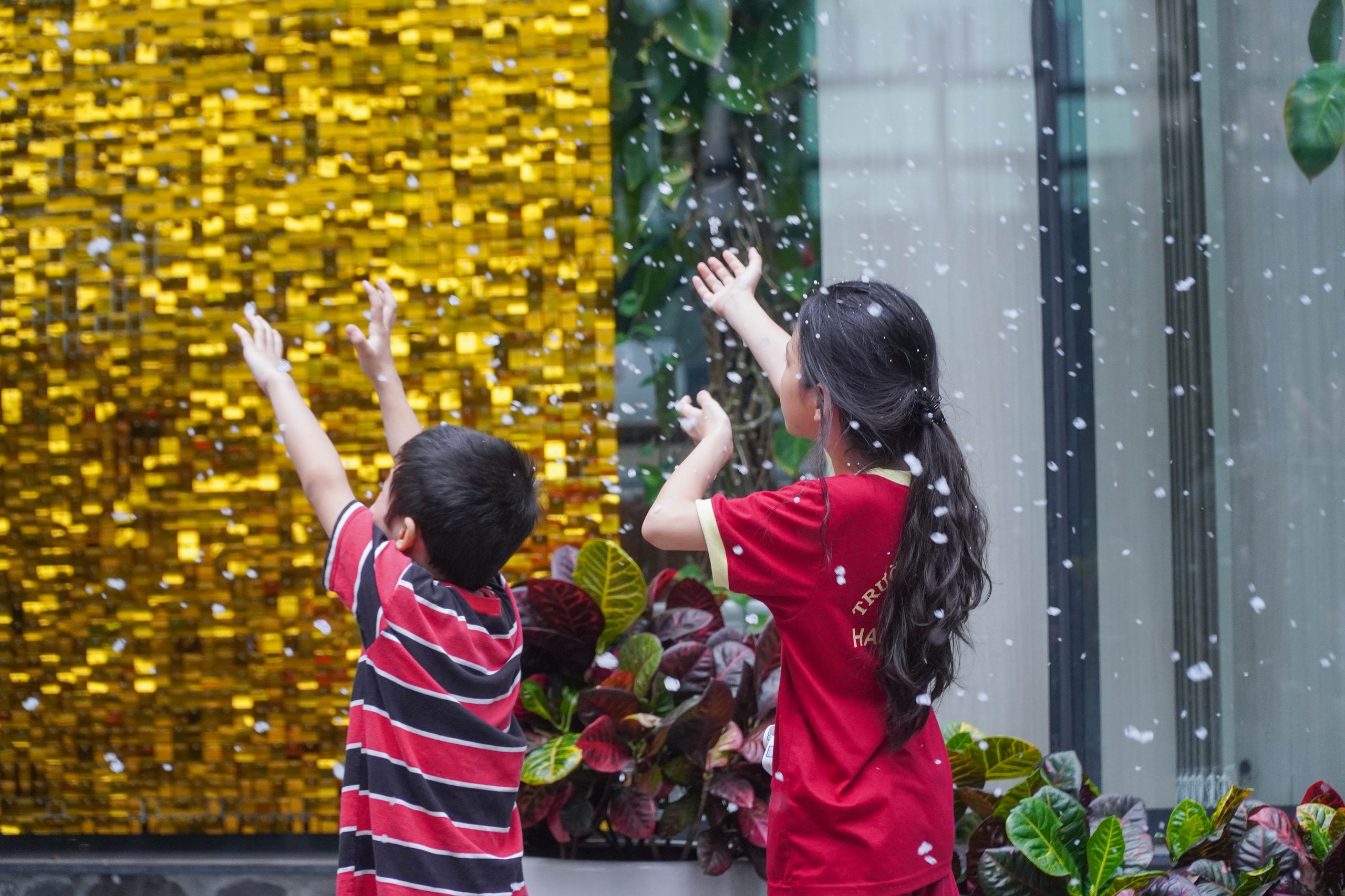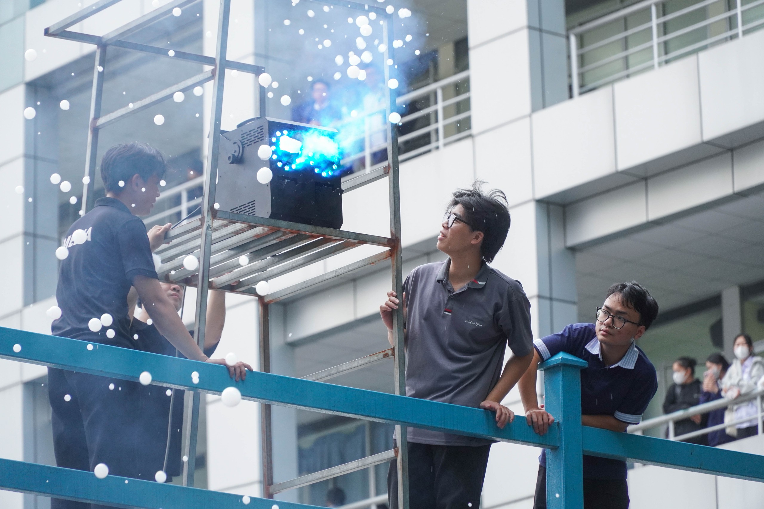 So với năm ngoái, năm nay nhà trường "chơi lớn" với dàn phun tuyết "xịn" hơn, ngoài máy phun tuyết còn có máy tạo bong bóng tuyết. Khi chạm tay vào, những bóng tuyết vỡ ra, tan thành khói, tạo cảm giác mới lạ và ấn tượng.