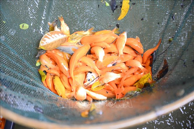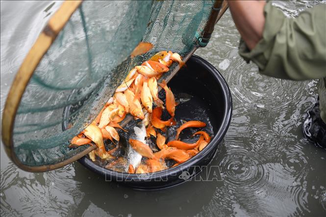 Người dân thu hoạch cá chép đỏ phục vụ Tết ông Công, ông Táo. Ảnh: Hoa Mai/TTXVN