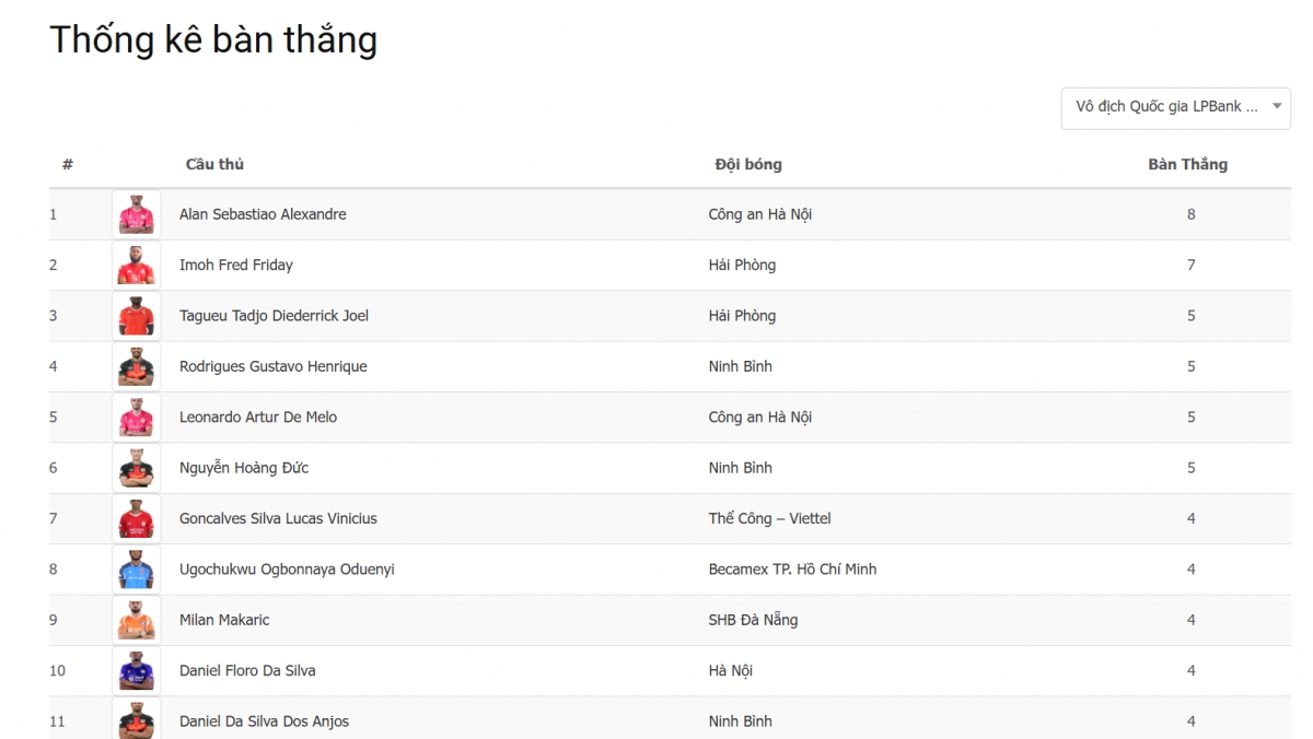 Cuộc đua đến danh hiệu vua phá lưới V-League 2025/2026 đang có những diễn biến rất hấp dẫn. Tiền đạo Alan của CLB CAHN vẫn dẫn đầu với tám bàn thắng. Tuy nhiên, nền tảng thể lực của cầu thủ này đang bị ảnh hưởng do phải thi đấu nhiều giải. Ở vòng gần nhất, cầu thủ người Brazil đã không thể ra sân.