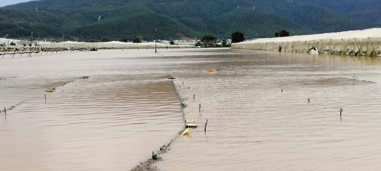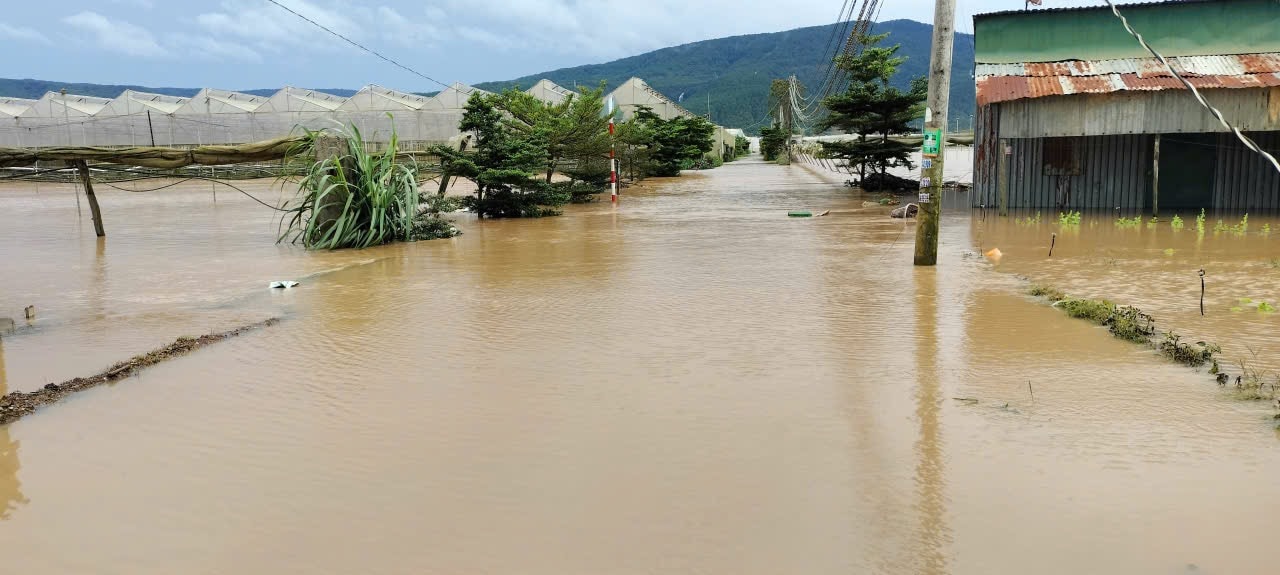 Đường giao thông liên thôn và nhà lưới của người dân vẫn còn ngập
