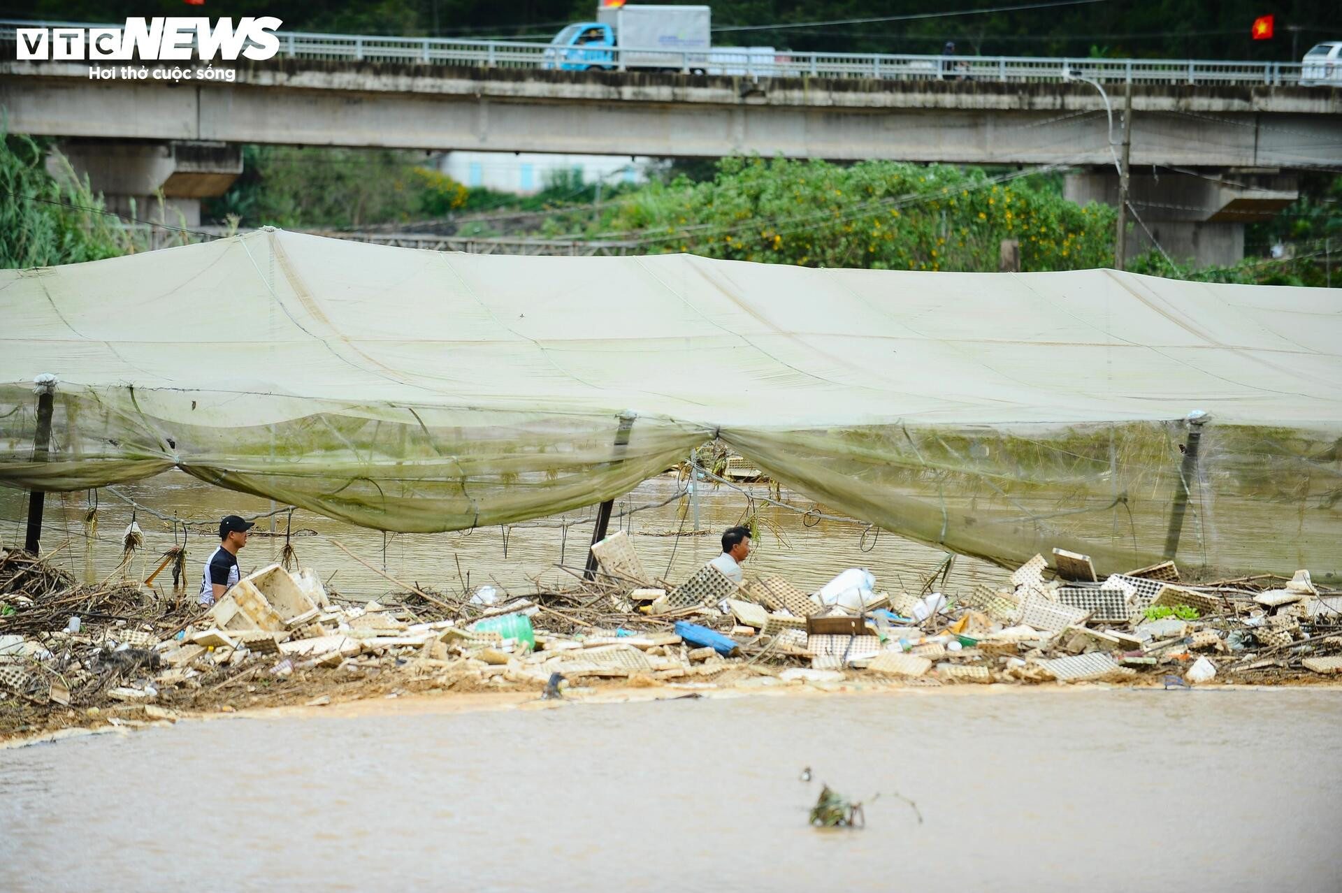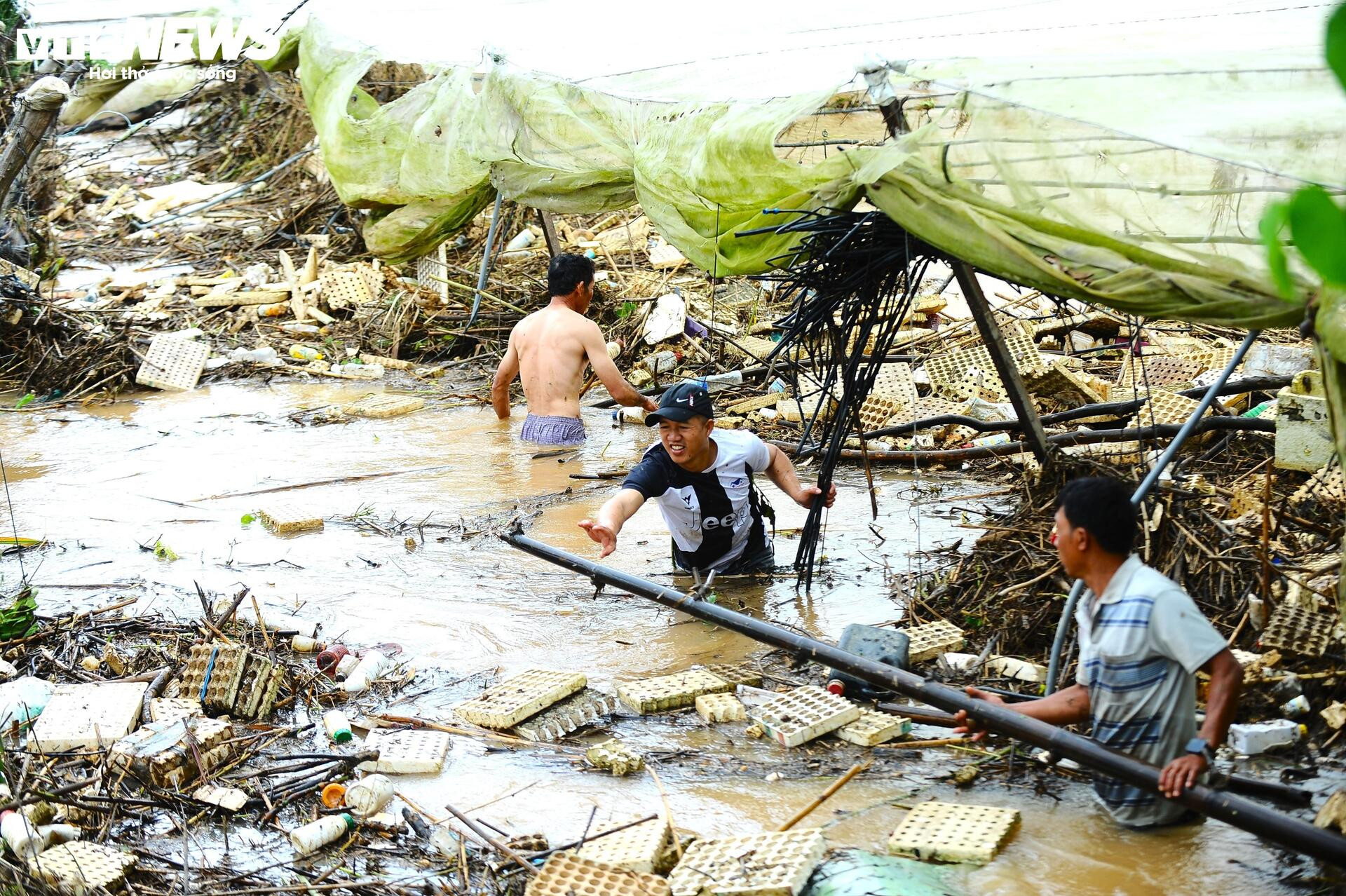 Nước ngập kèm rác thải đã phá hủy hệ thống nhà lồng, nhà kính của người dân hoàn toàn.