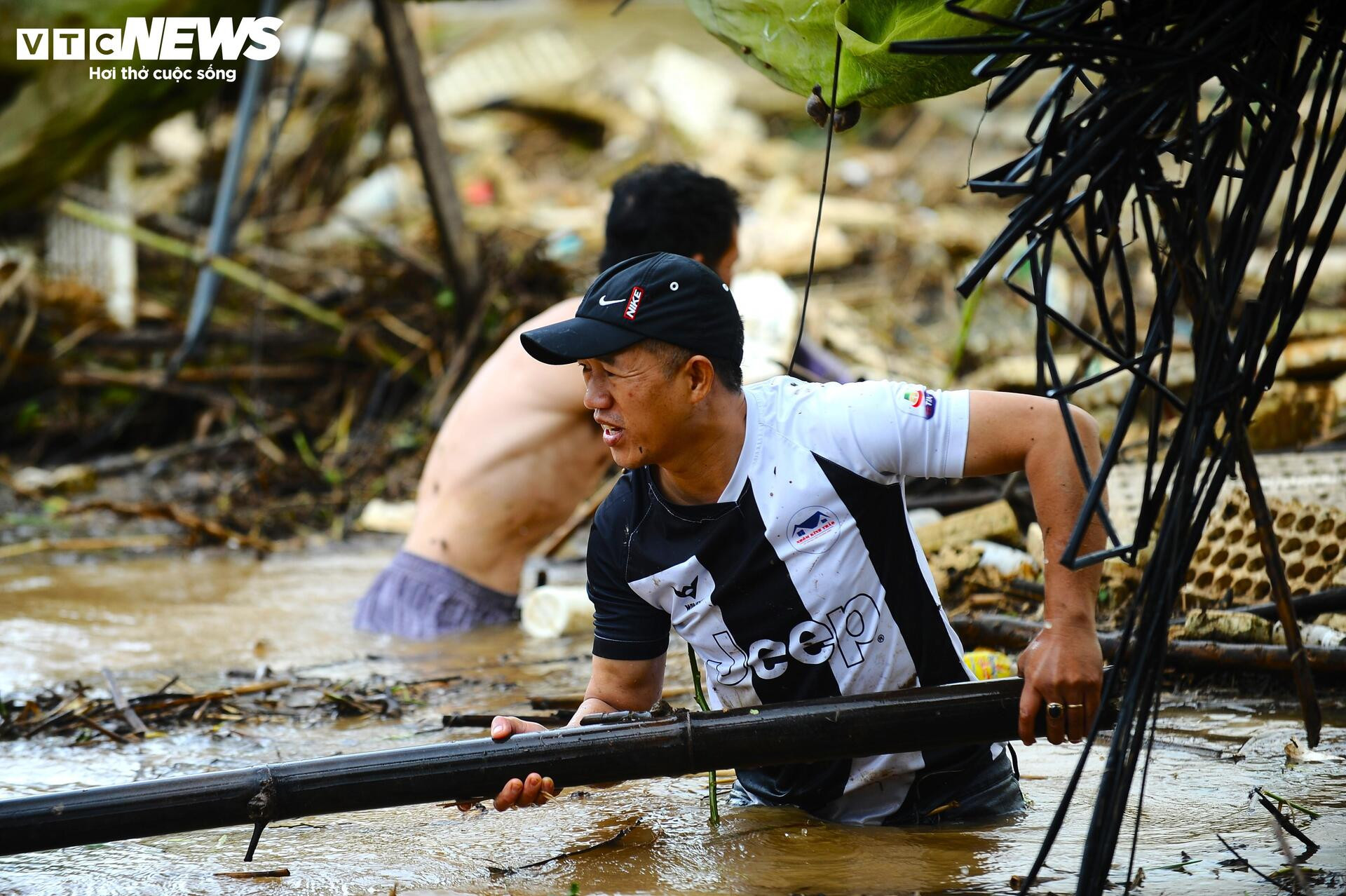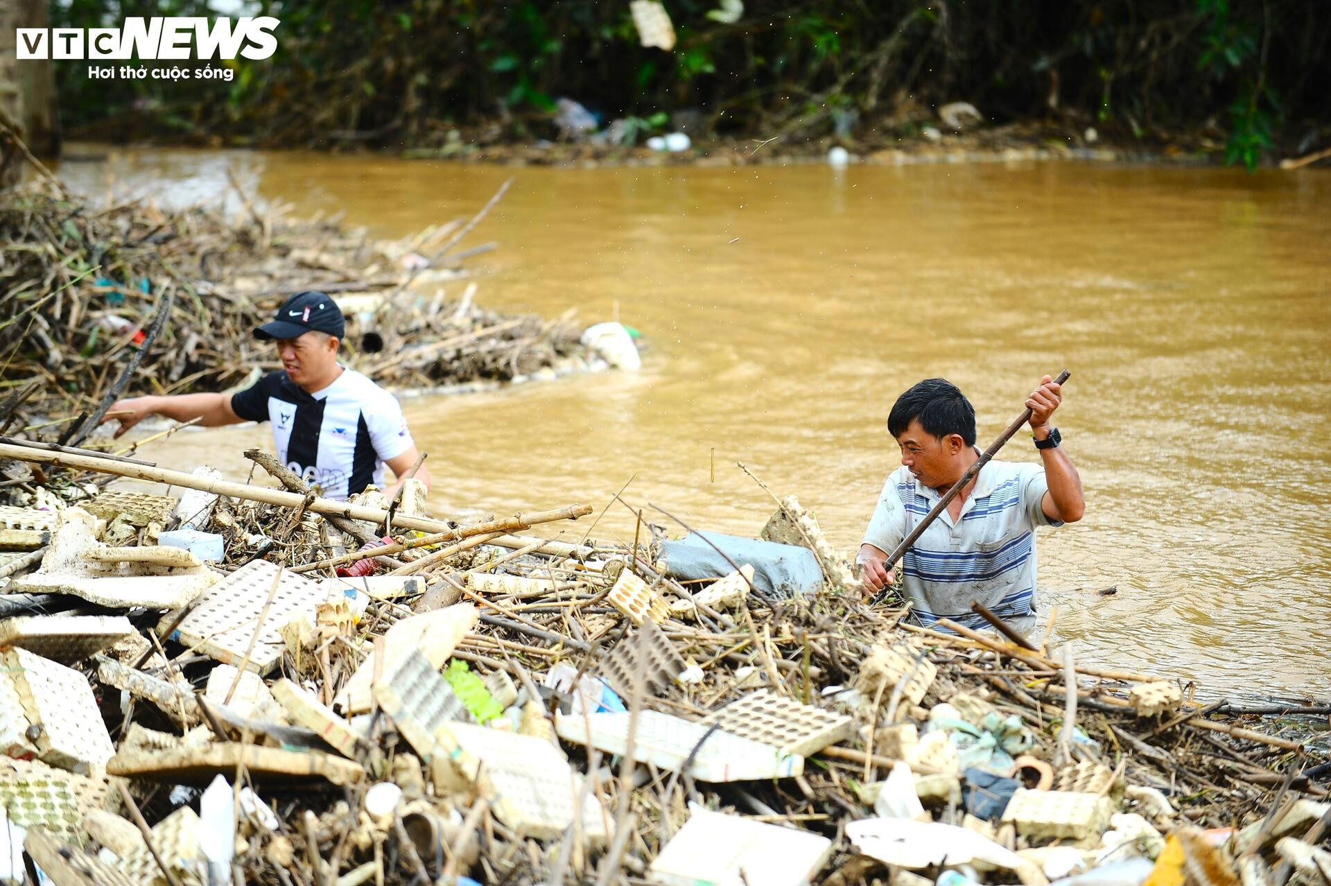 Nước ngập kèm theo rác thải khắp nơi ùa về, người dân phải vật lộn giữa núi rác trong nước để dọn dẹp.