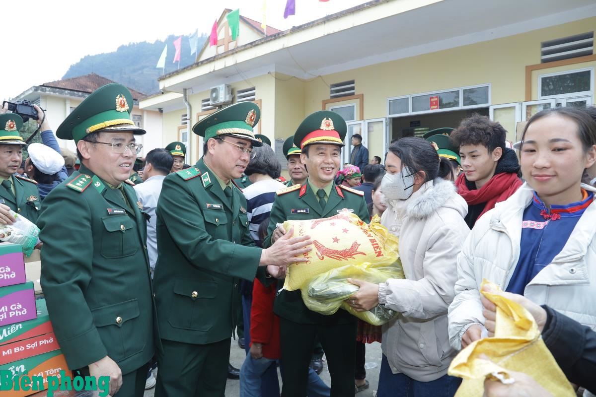 Thiếu tướng Võ Tiến Nghị trao quà của Đảng ủy, Bộ Tư lệnh Bộ đội Biên phòng tặng cán bộ, chiến sĩ Đồn Biên phòng Tả Gia Khâu và cán bộ, nhân dân xã Pha Long, tỉnh Lào Cai. Ảnh: Ngọc Lâm