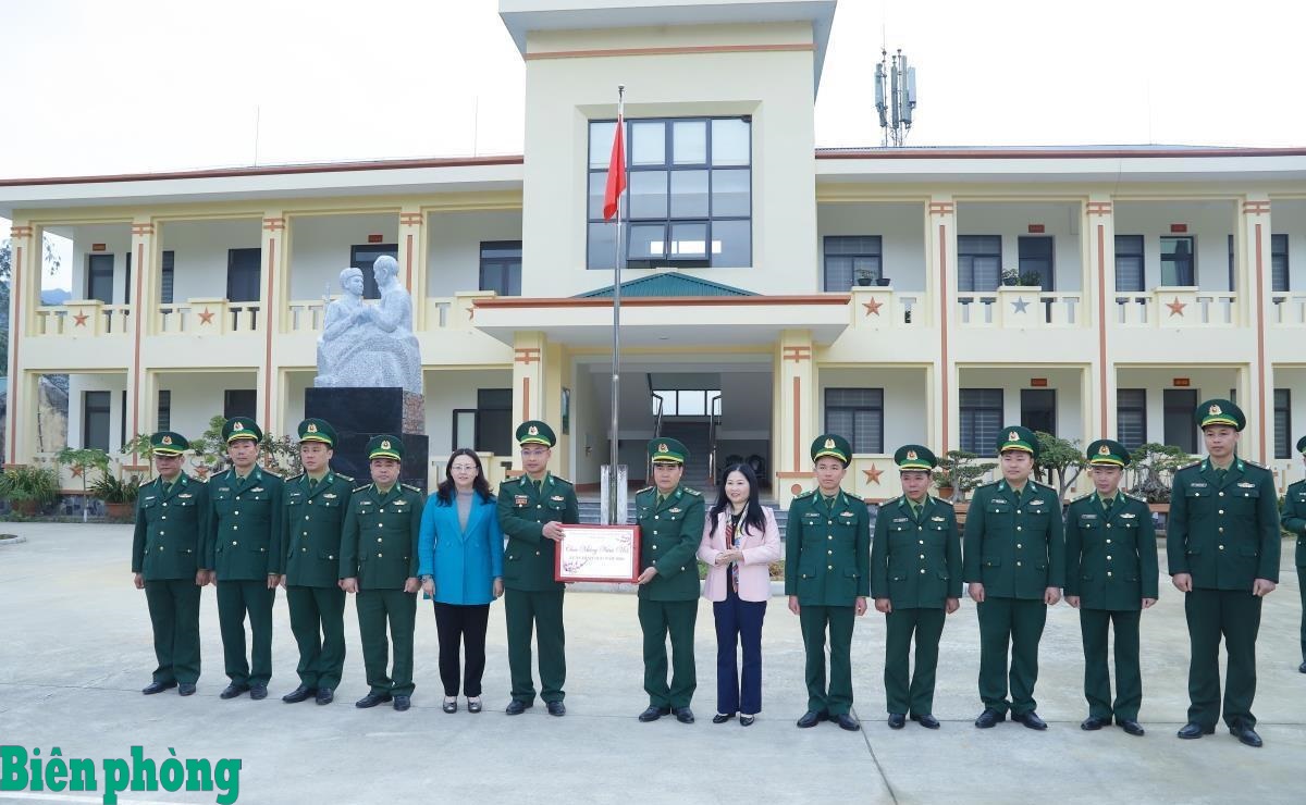 Đồng chí Giàng Thị Dung tặng quà cán bộ, chiến sĩ Đồn Biên phòng Pha Long. Ảnh: Ngọc Lâm