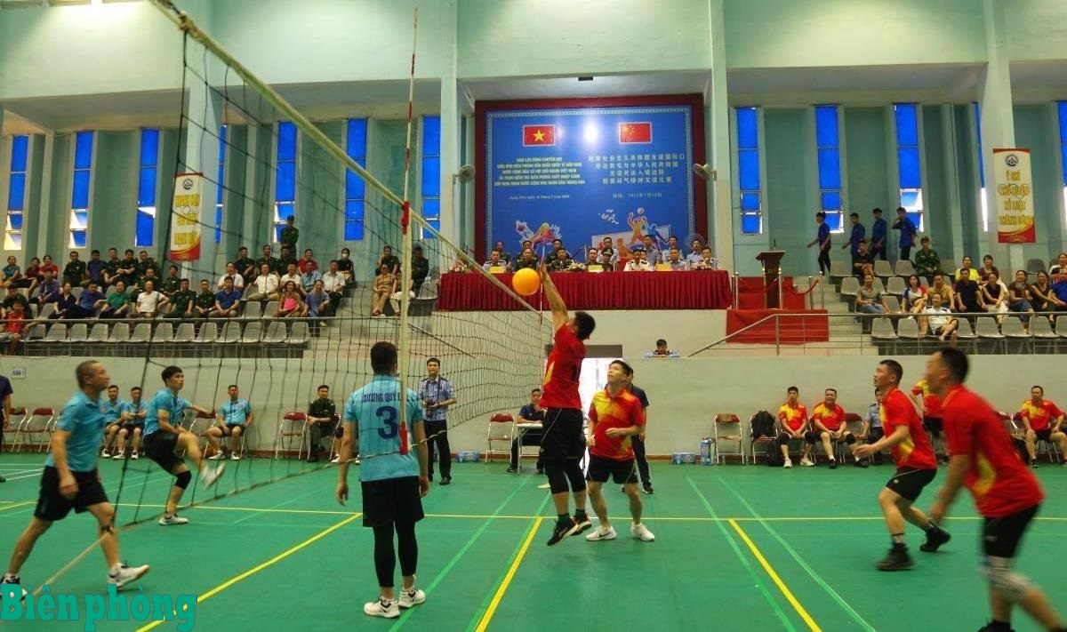 Đồn Biên phòng cửa khẩu quốc tế Hữu Nghị và Trạm Kiểm tra Biên phòng xuất nhập cảnh Hữu Nghị Quan thi đấu giao lưu bóng chuyền hơi. Ảnh: Vy Thượng