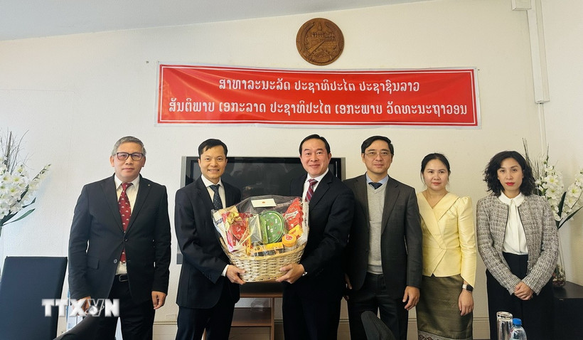 Nhân kỷ niệm 50 năm Quốc khánh nước Cộng hòa Dân chủ Nhân dân Lào (2/12/1975-2/12/2025), sáng 25/11, tại Geneva (Thụy Sĩ), Công sứ Cung Đức Hân, Phó Trưởng Phái đoàn đại diện thường trực Việt Nam bên cạnh Liên hợp quốc, Tổ chức Thương mại thế giới (WTO) và các tổ chức quốc tế khác tại Geneva, cùng các cán bộ, nhân viên Phái đoàn Việt Nam đã tới chúc mừng lãnh đạo và các cán bộ, nhân viên Phái đoàn Lào tại trụ sở phái đoàn đại diện thường trực Lào bên cạnh Liên hợp quốc, WTO và các tổ chức quốc tế khác tại Geneva.