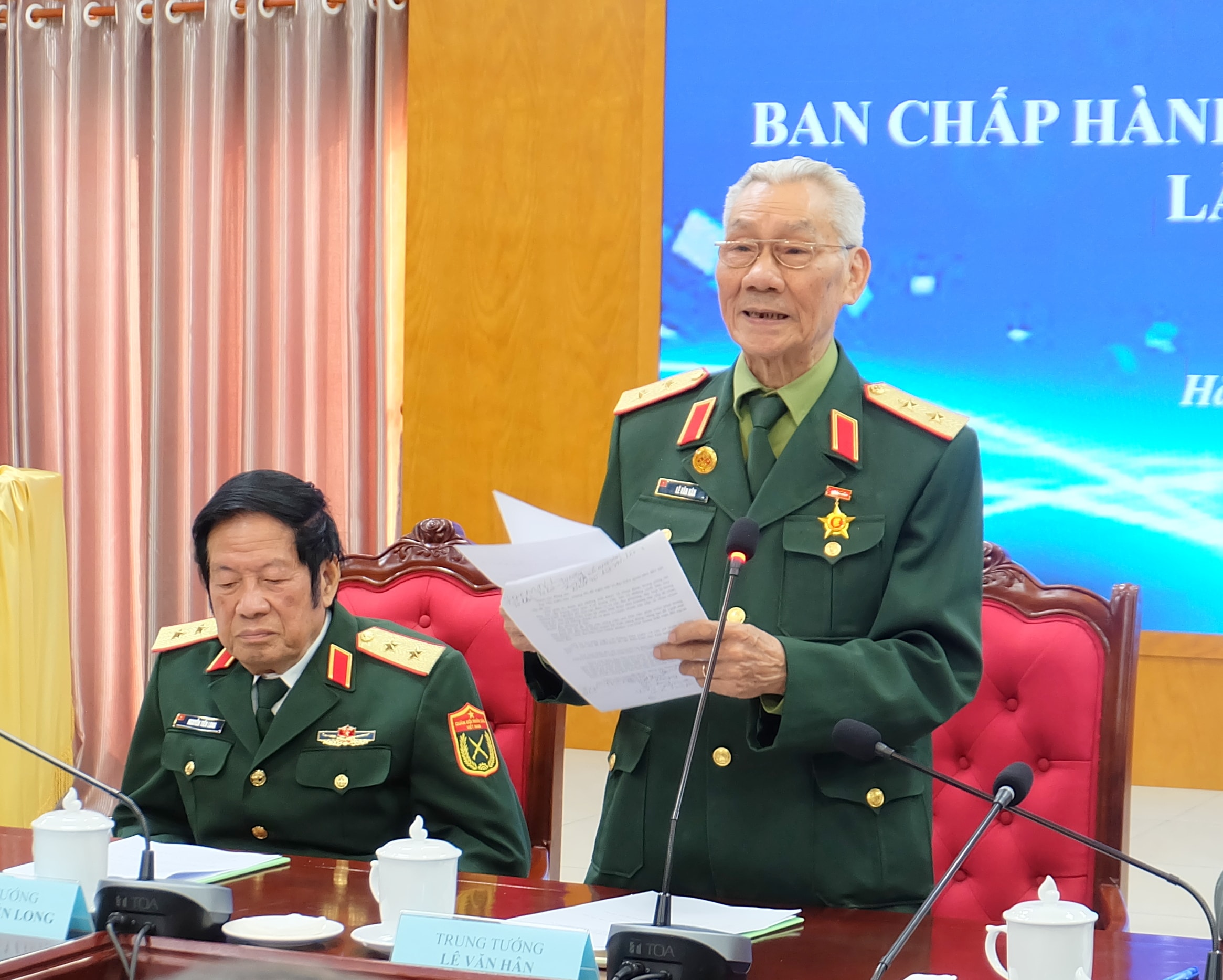 Trung tướng Lê Văn Hân, Phó Chủ tịch Hội Hữu nghị Việt Nam - Lào phát biểu tại Hội nghị