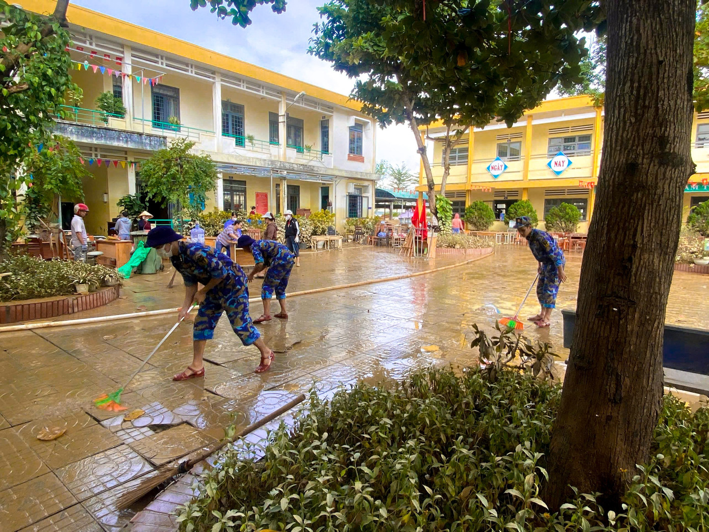 Cán bộ, chiến sĩ tham gia vệ sinh, dọn dẹp tại các trung tâm và trường học bị ngập.