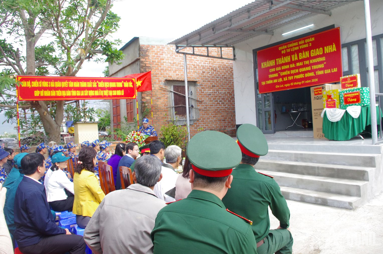 Phát biểu tại buổi lễ, Đại tá Phạm Anh Tuấn, Tư lệnh Vùng 3 Hải quân nhấn mạnh: “Cuối năm 2025, các đợt thiên tai liên tiếp với tính chất đặc biệt nghiêm trọng đã gây thiệt hại nặng nề cho nhiều địa phương miền Trung, trong đó có tỉnh Gia Lai và xã Tuy Phước Đông. Thực hiện Công điện của Thủ tướng Chính phủ về triển khai “Chiến dịch Quang Trung”, với tinh thần “tất cả vì nhân dân phục vụ”, Vùng 3 đã phối hợp chặt chẽ với cấp ủy, chính quyền địa phương khẩn trương tổ chức khảo sát, huy động lực lượng, phương tiện xây dựng nhà ở cho nhân dân bị ảnh hưởng bởi thiên tai”.