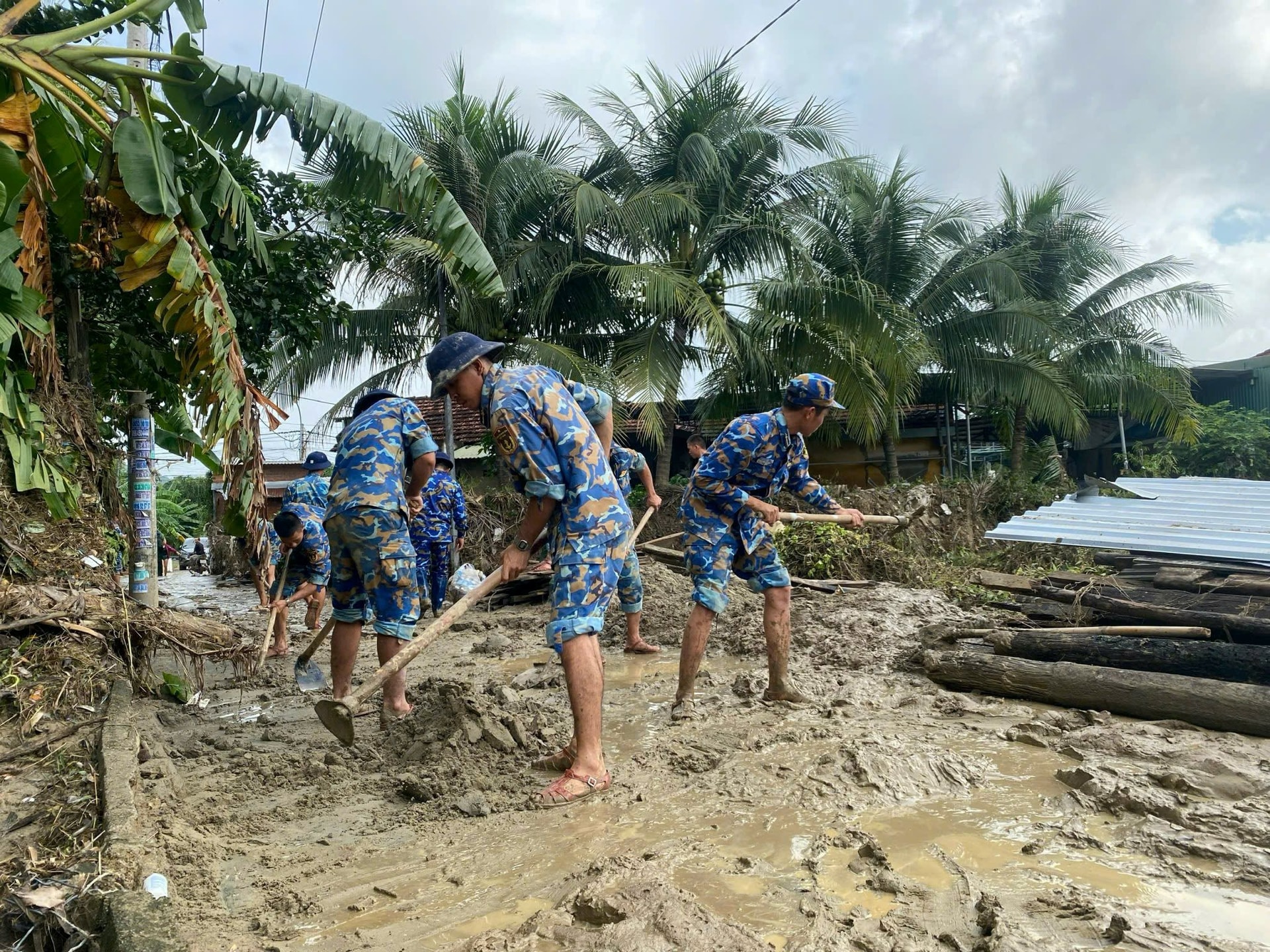 Mưa lũ kéo dài khiến nhiều công trình dân sinh, nhà ở, trường học bị bồi lấp, lượng bùn đất tồn đọng lớn, ảnh hưởng nghiêm trọng đến sinh hoạt của nhân dân. Trước tình hình đó, lực lượng Vùng 4 tập trung tổng vệ sinh, khơi thông dòng chảy, thu gom rác thải, làm sạch đường giao thông và hỗ trợ từng hộ dân khắc phục hậu quả.