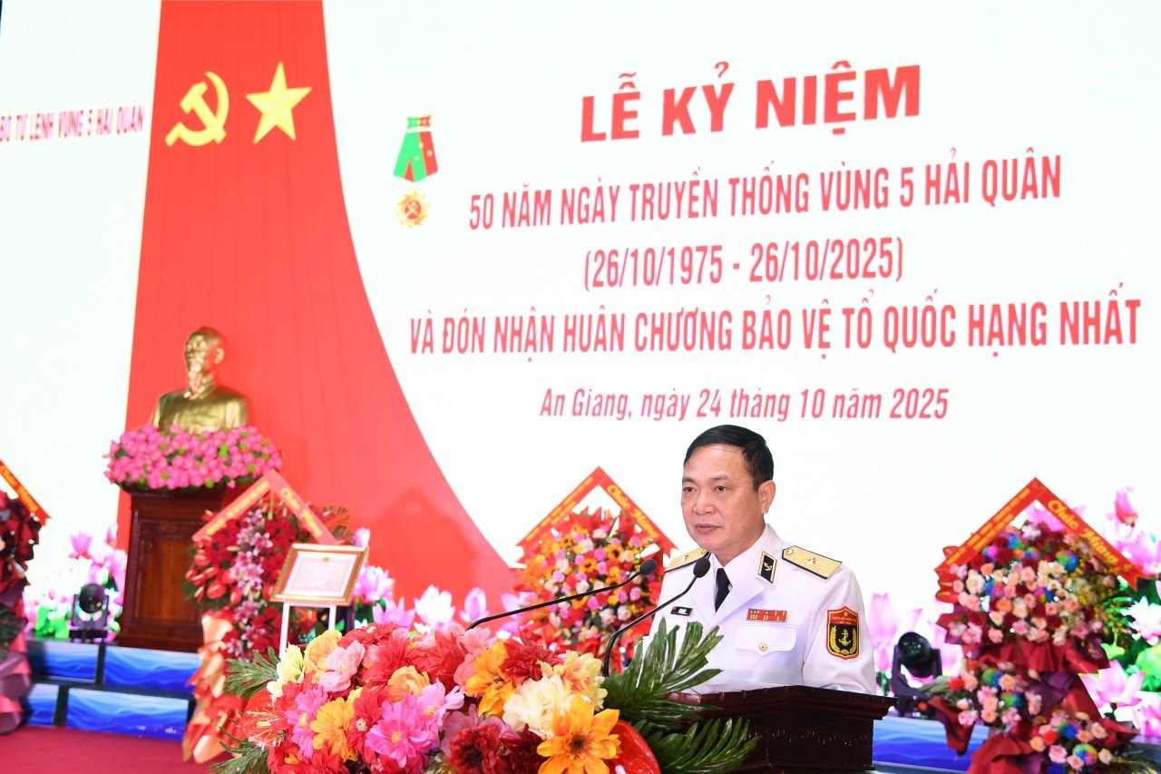Phát biểu tại buổi lễ, Chuẩn Đô đốc Trịnh Xuân Tùng, Tư lệnh Vùng 5 Hải quân, ôn lại chặng đường 50 năm xây dựng, chiến đấu và trưởng thành của đơn vị. Ngay sau ngày đất nước thống nhất, khi biên giới Tây Nam bị quân Pôn Pốt - Iêng Xa-ri xâm chiếm, tàn sát đồng bào, Đoàn Hải quân Phú Quốc - tiền thân của Vùng 5 Hải quân - đã phối hợp với các lực lượng tiến công, giải phóng đảo Thổ Chu và các đảo phía Tây Nam Tổ quốc, thu hồi toàn bộ chủ quyền vùng biển đảo thiêng liêng.