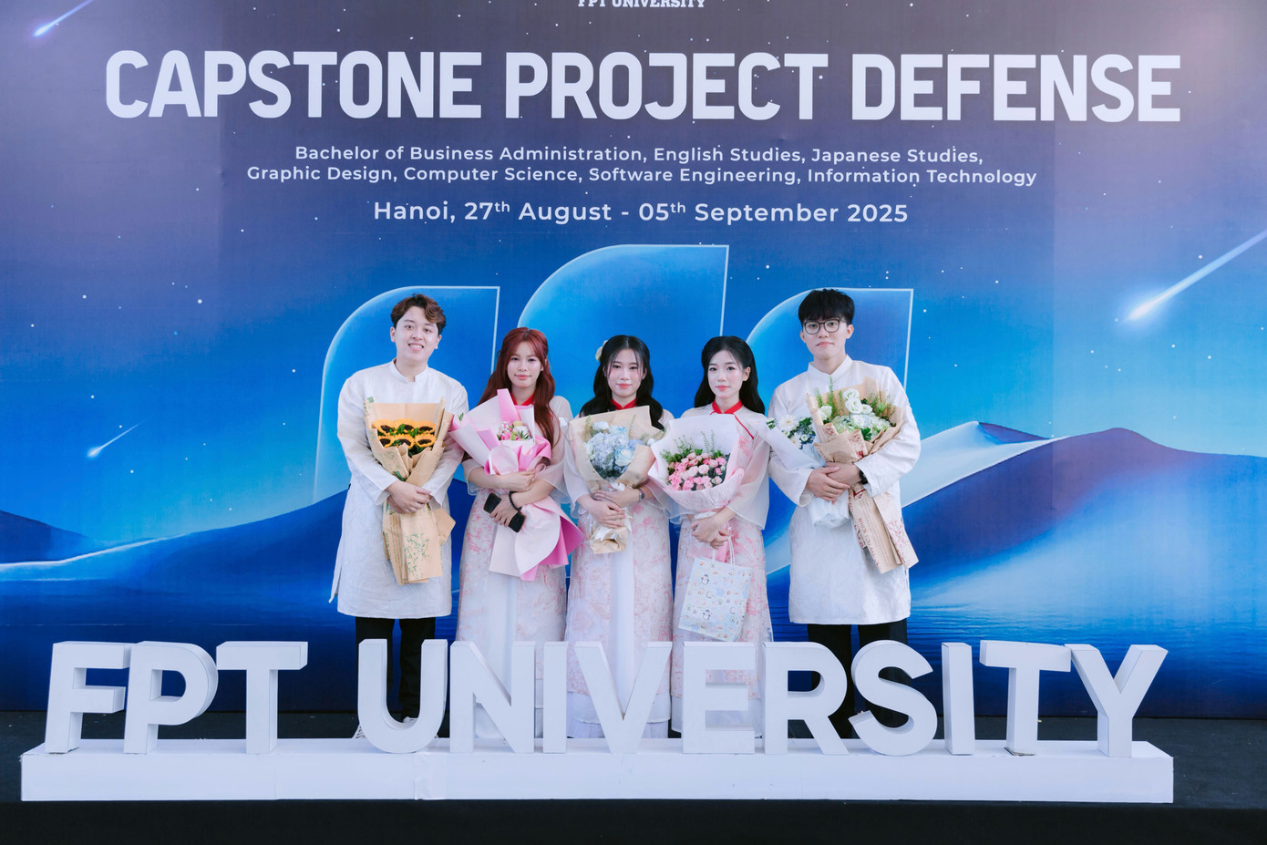 Sinh viên Nguyễn Hà Thanh (giữa) và các thành viên nhóm trong buổi bảo vệ đồ án tại Đại học FPT – nơi nhiều dự án sinh viên bước đầu tiếp cận hành trình khởi nghiệp.