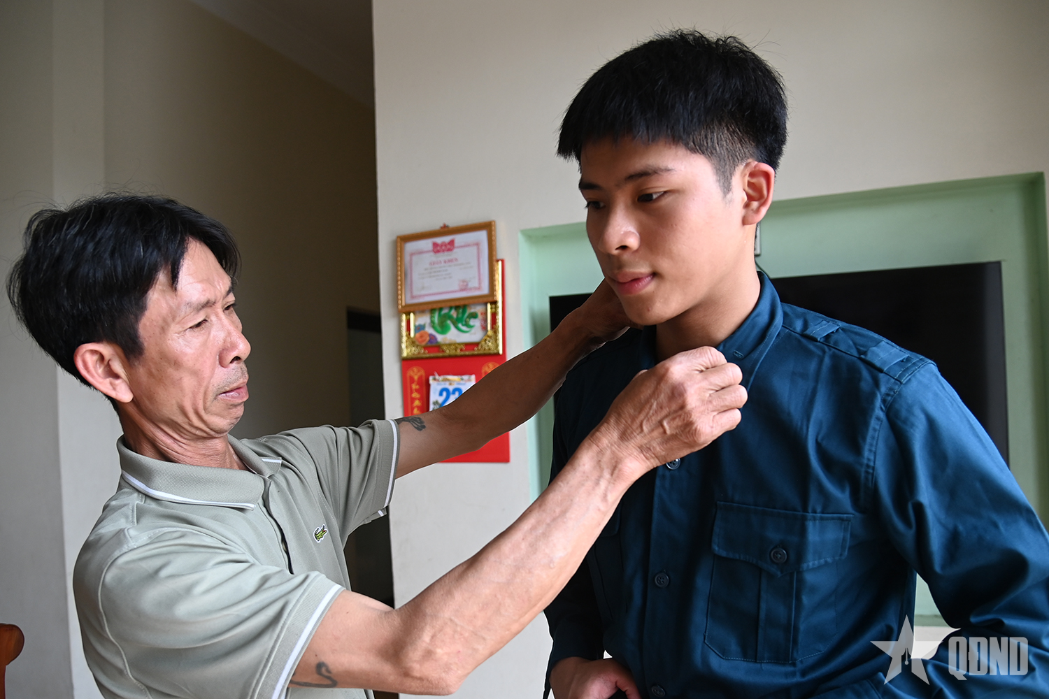 Ông Lại Văn Hoành, bố của thanh niên Lại Thành Nam (khu Trại Thành, phường Đông Mai), chỉnh lại quân phục cho con trai trước ngày lên đường nhập ngũ.