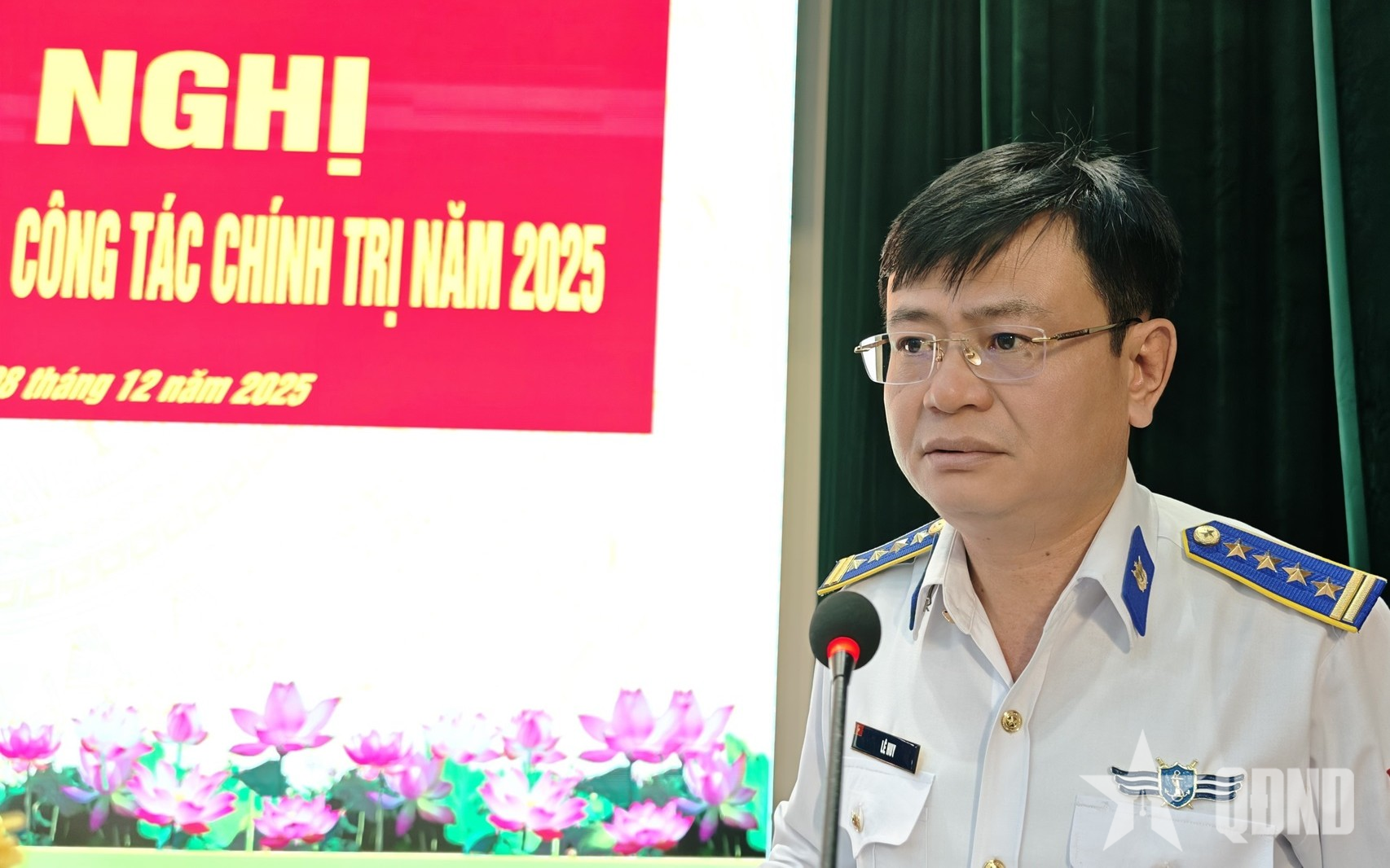 Đại tá Lê Huy, Chính ủy Vùng Cảnh sát biển 2 phát biểu tại hội nghị