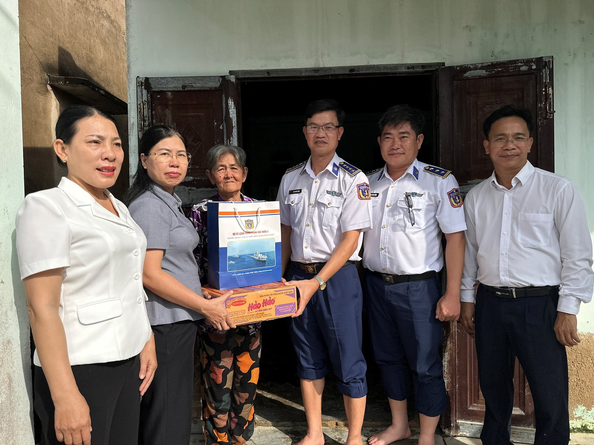 Dịp này, Đoàn công tác trao 50 suất quà nhu yếu phẩm tặng các gia đình chính sách và ngư dân có hoàn cảnh khó khăn; trao cờ Tổ quốc, túi thuốc y tế, áo phao và đèn pin tặng ngư dân tại cảng cá.