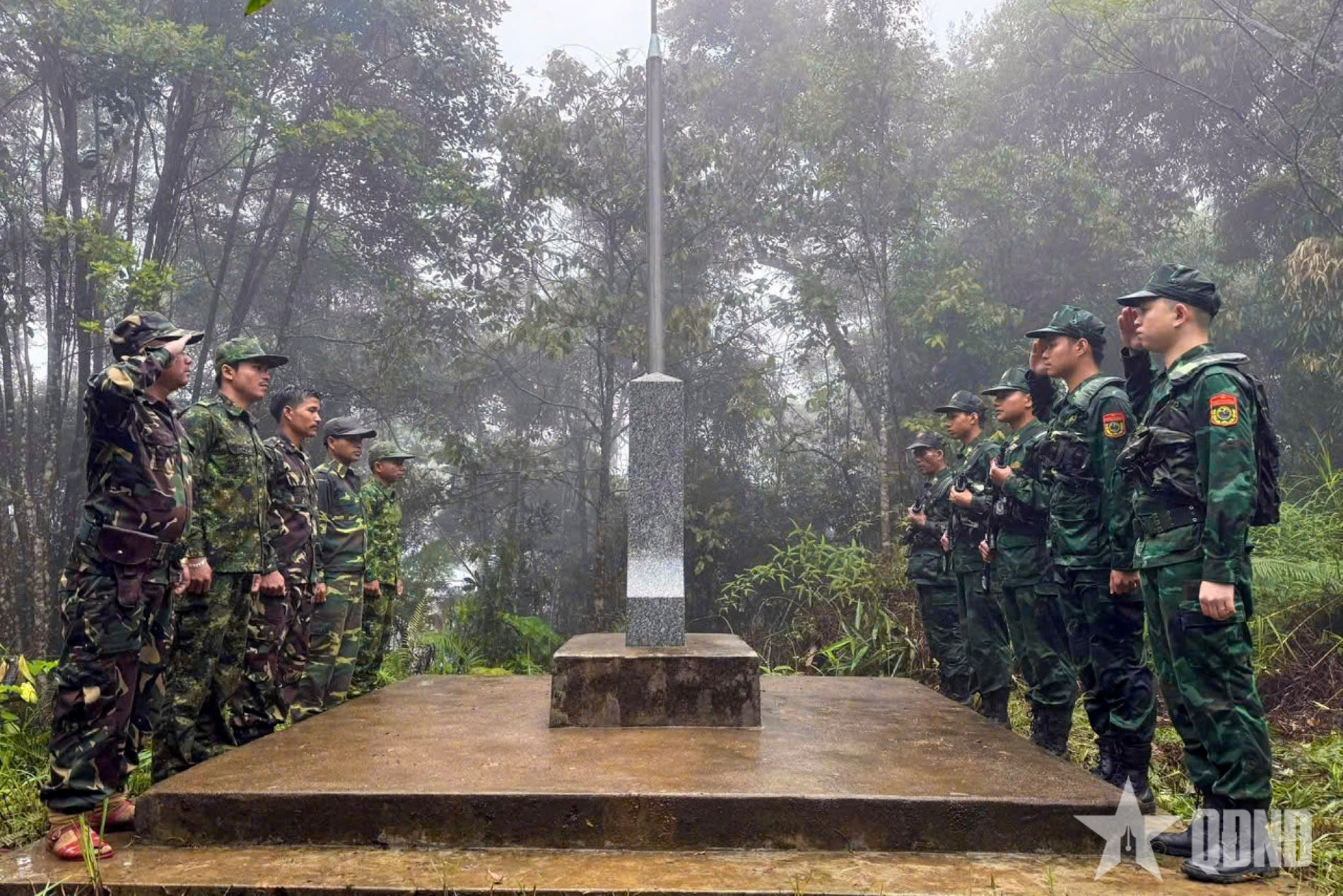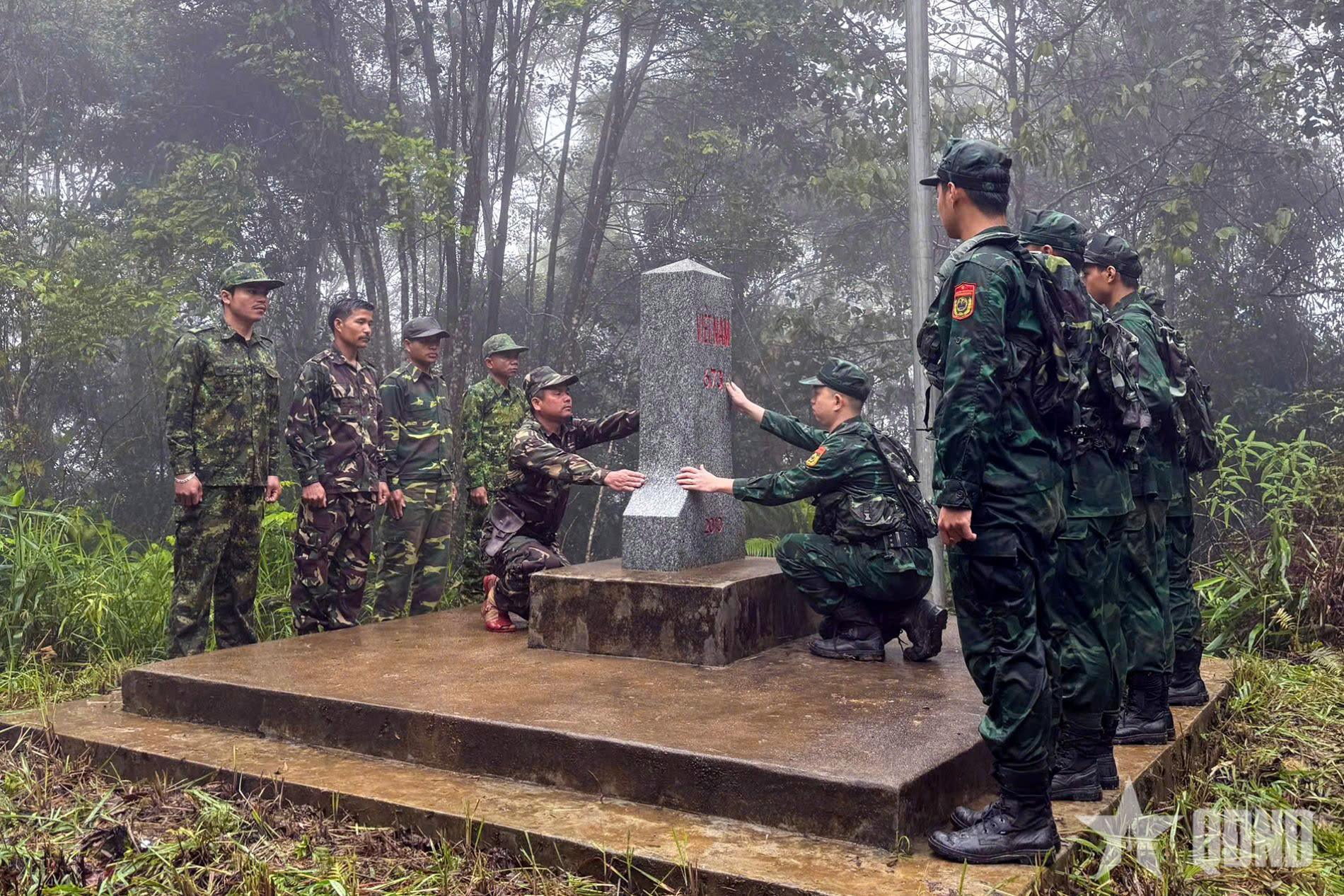 Cán bộ, chiến sĩ Đồn Biên phòng Hương Nguyên phối hợp với Đại đội Bảo vệ Biên giới 531, Bộ CHQS tỉnh Sê Kông (Lào) kiểm tra cột mốc biên giới trong chuyến tuần tra song phương, góp phần giữ vững an ninh, trật tự khu vực biên giới trước thềm cuộc bầu cử.