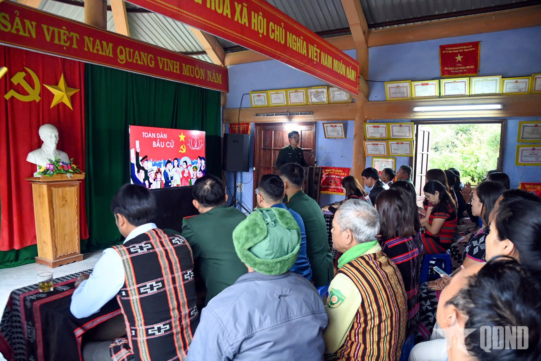 Cán bộ, chiến sĩ Đồn Biên phòng Quảng Nhâm phối hợp chính quyền địa phương phổ biến trực tiếp các quy định về bầu cử cho người dân tại điểm sinh hoạt văn hóa thôn Tu Vay, xã A Lưới 3.