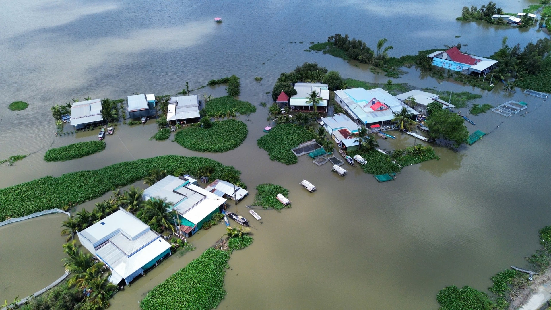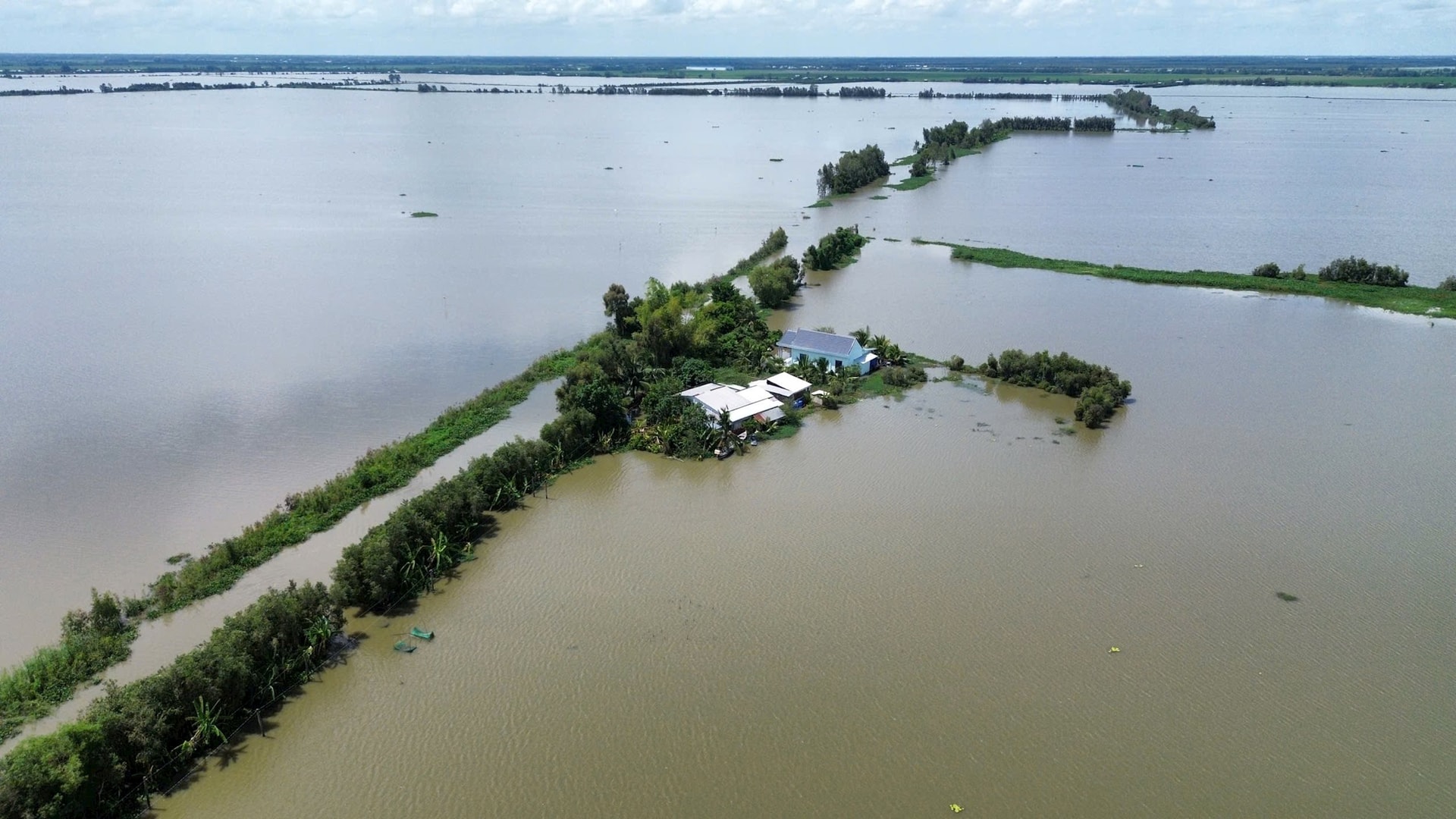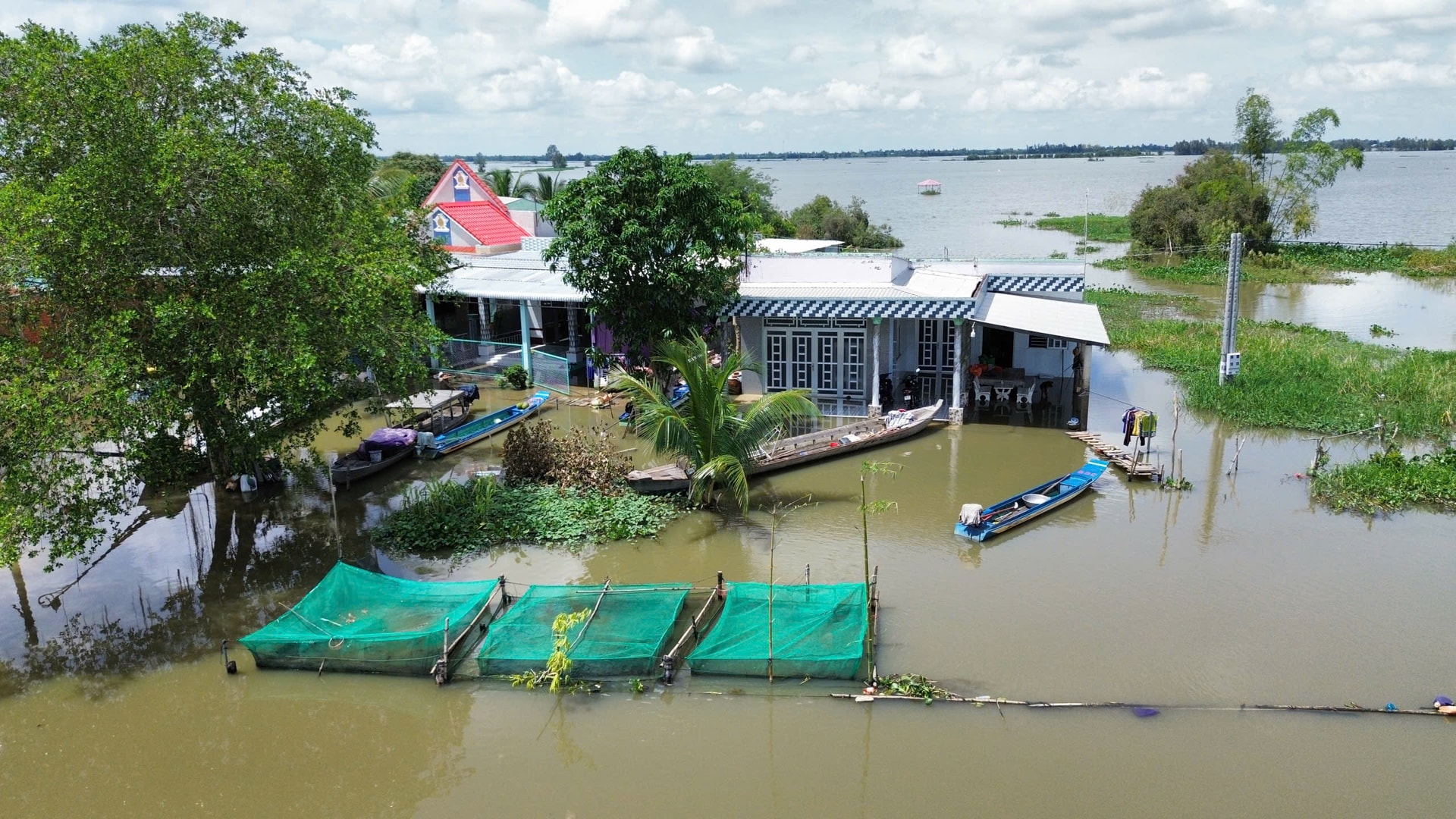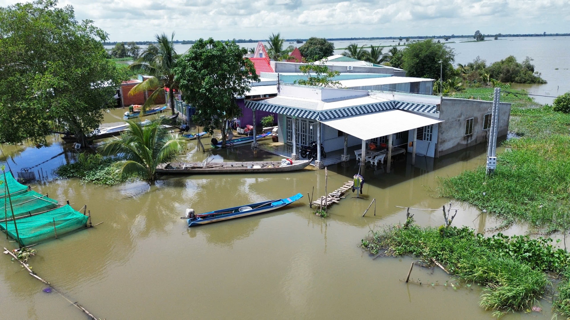 Ghi nhận tại các xã Vĩnh Châu, Khánh Hưng (tỉnh Tây Ninh), trong những ngày qua, nhiều ngôi nhà, ruộng lúa, vườn cây trái của người dân bị ngập sâu trong nước.