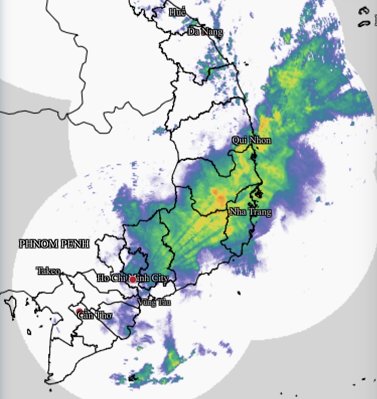 Ảnh radar thời tiết lúc 8 giờ sáng nay 25-10 với một dải mây ẩm khổng lồ đang quét từ biển vào Nam Trung bộ, Đông Nam bộ và Tây Nguyên