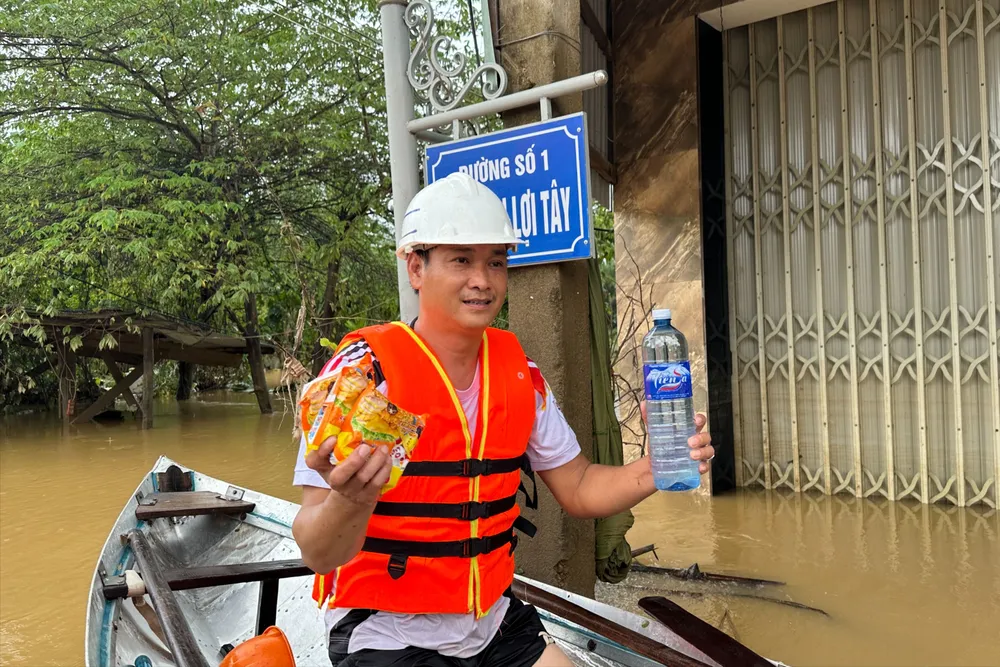 Đường ngập, anh Lê Phước Trường (thôn An Lợi Tây) chưa thể đến nơi làm việc. Tổ trưởng thông báo có đoàn thiện nguyện tiếp tế cho bà con, nhưng không thể vào xóm. Anh rủ hai người bạn, lấy chiếc ghe nhỏ của gia đình bơi ra đầu đường tiếp nhận, phân phát đến từng nhà.