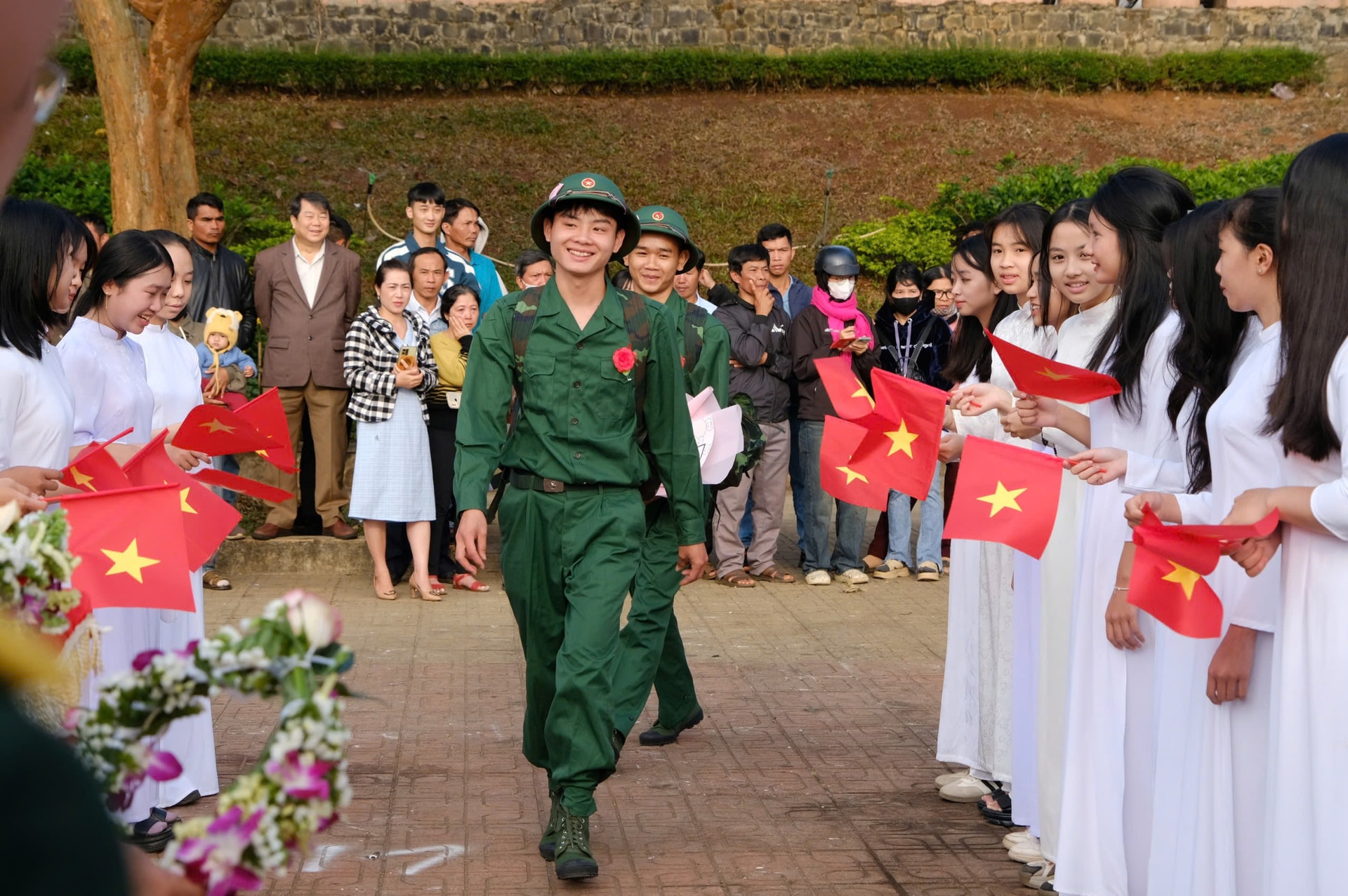 Sáng 4/3, cùng với cả nước, những thanh niên ưu tú của Lâm Đồng lên đường thực hiện nhiệm vụ. Tại 12 điểm giao quân trong toàn tỉnh đều có sự hiện diện của các đồng chí lãnh đạo tỉnh. Đó là nguồn động viên, khích lệ to lớn để hàng ngàn thanh niên thêm vững bước; đồng thời cũng là sự khẳng định trách nhiệm của địa phương đối với hậu phương của tân binh. Mỗi vòng hoa được trao, từng món quà được tặng, những cái bắt tay thân tình với tân binh như gửi gắm niềm tin của cả quê hương.