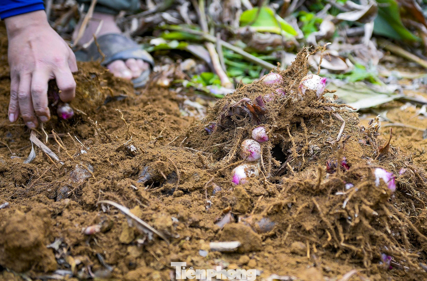 Củ dong riềng thường nằm nông, cách mặt đất khoảng 10-15 cm, người dân chỉ cần dùng cuốc hất nhẹ là có thể thu hoạch.