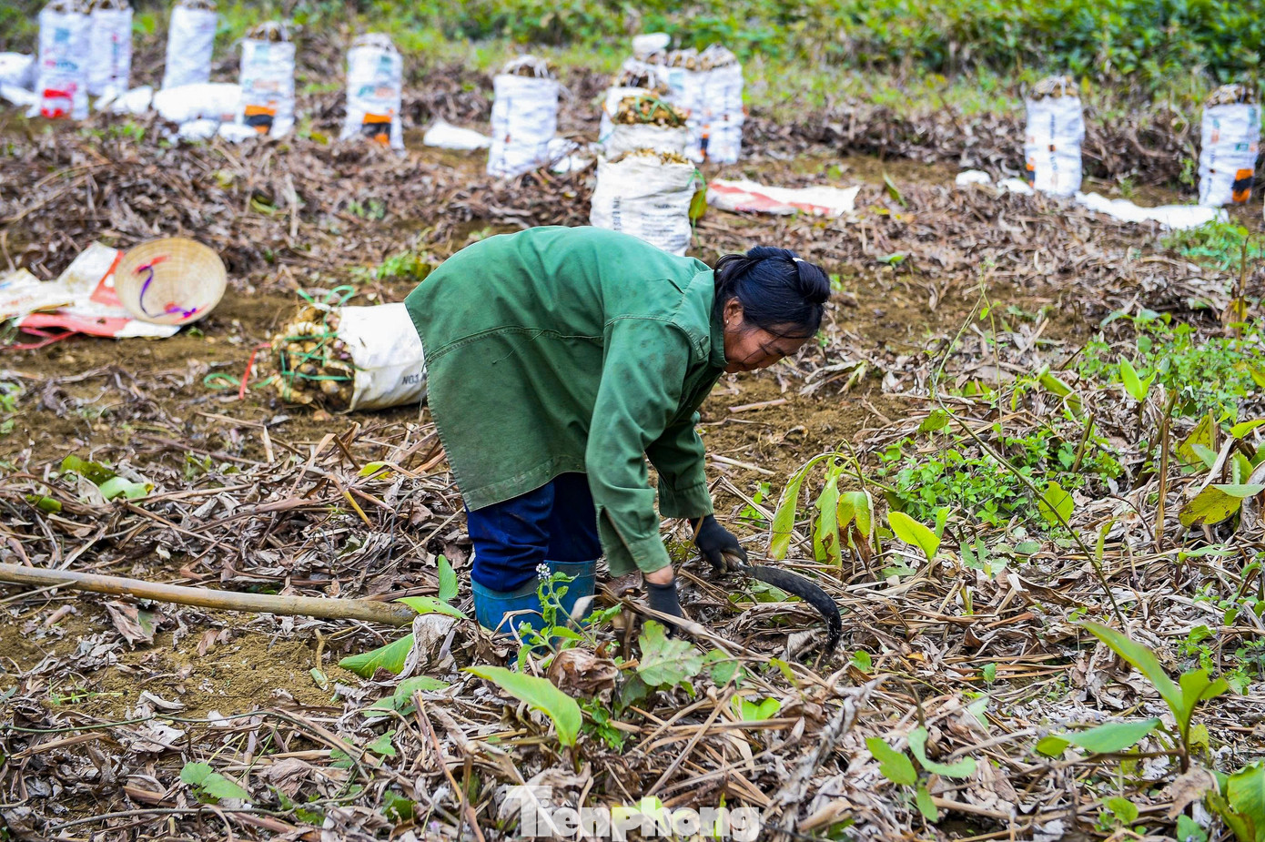 Dong củ sau khi phân loại sẽ được đóng vào từng bao tải xuất bán cho thương lái hoặc chở về xưởng nghiền bột làm miến.