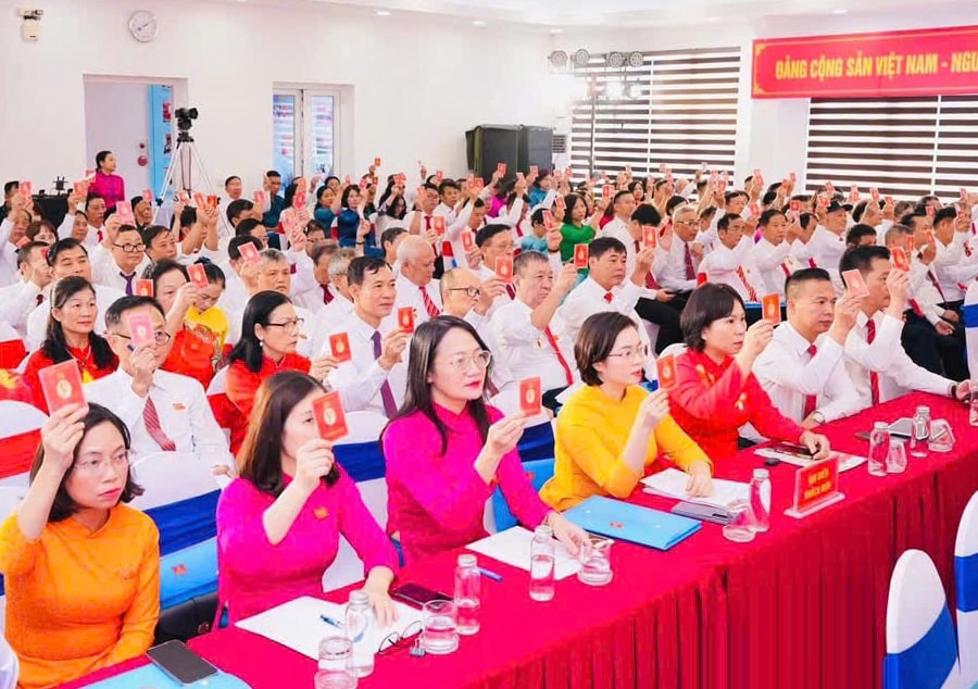 Đại biểu biểu quyết thông qua các nội dung tại Đại hội đại biểu Đảng bộ phường Phúc Lợi lần thứ I, nhiệm kỳ 2025-2030.