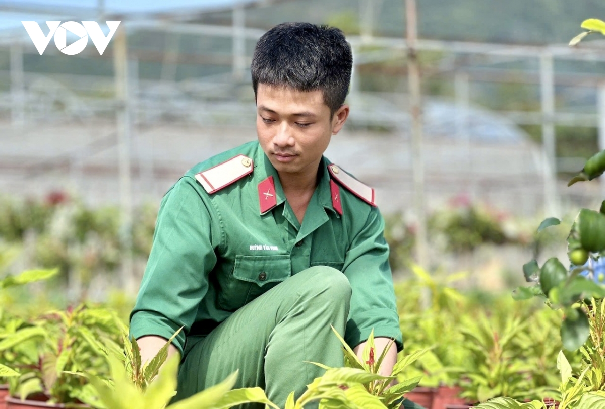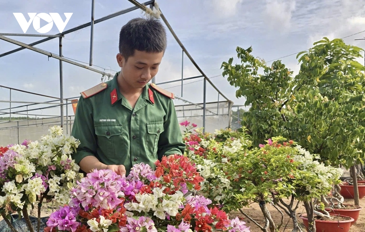 Tại khu vực vườn ươm Tiểu đoàn 445, chiến sĩ Trần Quốc Trung (Đại đội 1, Trung đội 5), Trung đoàn Minh Đạm đang tỉ mỉ cắt tỉa từng nhánh hoa giấy. Chiến sĩ Trung chia sẻ, trước khi nhập ngũ, anh chưa từng biết đến kỹ thuật nông nghiệp. Tuy nhiên, nhờ sự hướng dẫn tận tình của chỉ huy trong các giờ tăng gia, những tân binh như anh giờ đã thành thạo kỹ thuật bón phân, tưới nước cho từng chủng loại.