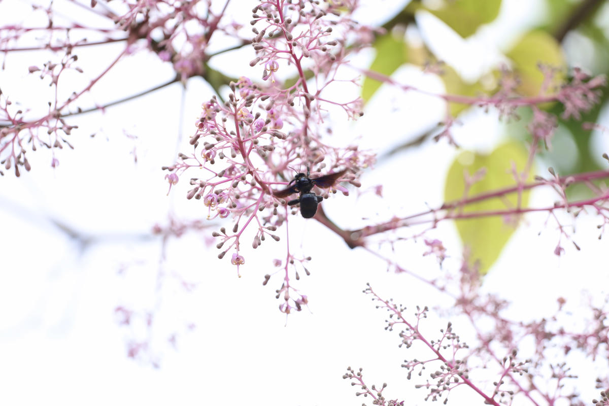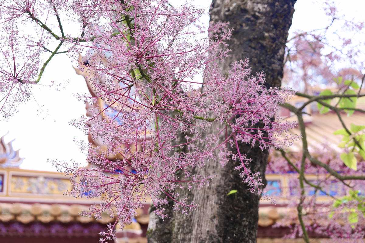 Sau khi trút bỏ hết lá, cây ngô đồng hiện lên với những chùm hoa nhỏ li ti, phủ sắc hồng dịu dàng, tạo nên vẻ đẹp kiêu sa và đầy mê hoặc. Ảnh: T.N.