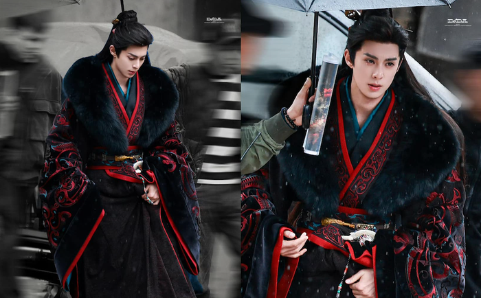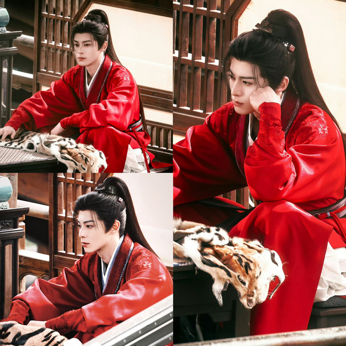 Trong loạt ảnh hậu trường, Vương Hạc Đệ xuất hiện với trang phục đỏ nổi bật, kiểu dáng cổ trang truyền thống kết hợp cùng mái tóc buộc cao, toát lên vẻ ngoài vừa thư sinh vừa sắc sảo.