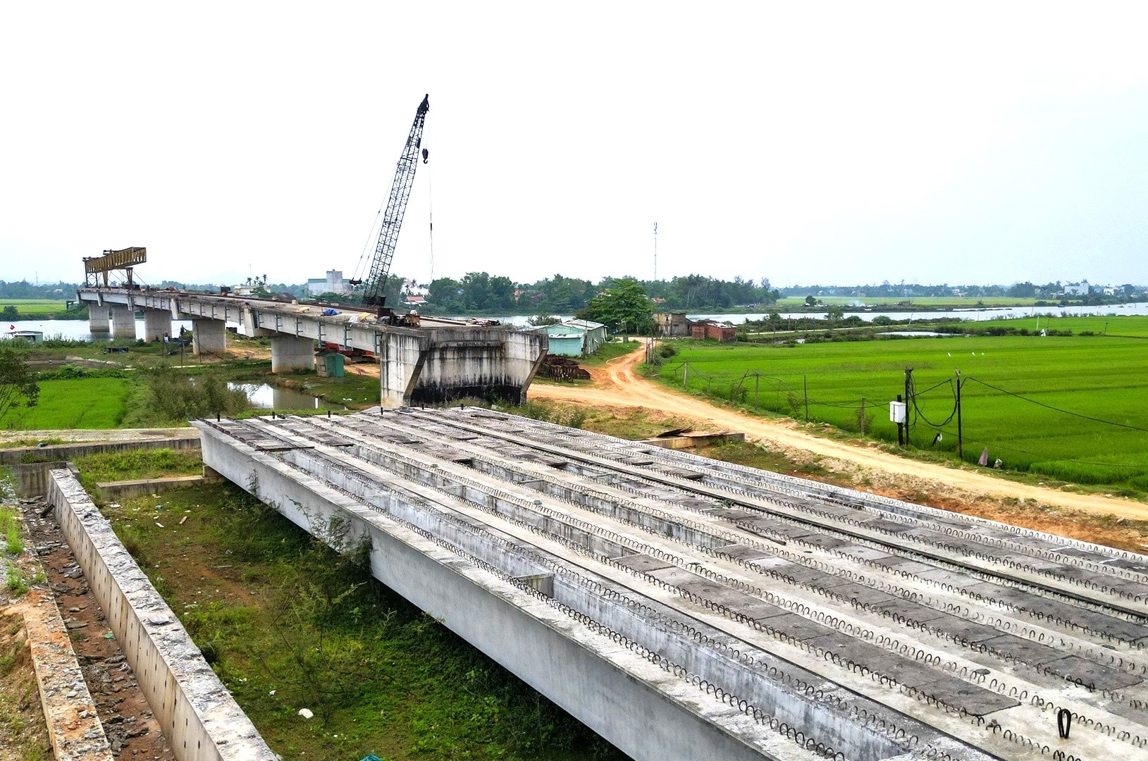 Trở lại công trường sau hơn 2 năm, chúng tôi ghi nhận nơi đây vẫn vắng vẻ lạ thường và không thấy bóng dáng công nhân làm việc. Các dầm cầu đúc sẵn rồi để đó. Xót xa là nhiều giàn giáo, cần cẩu, thiết bị máy móc... trần ai trong mưa nắng suốt thời gian dài. Từ cây cầu cũ hư hỏng, nhìn ra phía sông, chỉ thấy cầu mới đổ một số trụ, mố và nhịp cầu dừng lại… giữa dòng.
