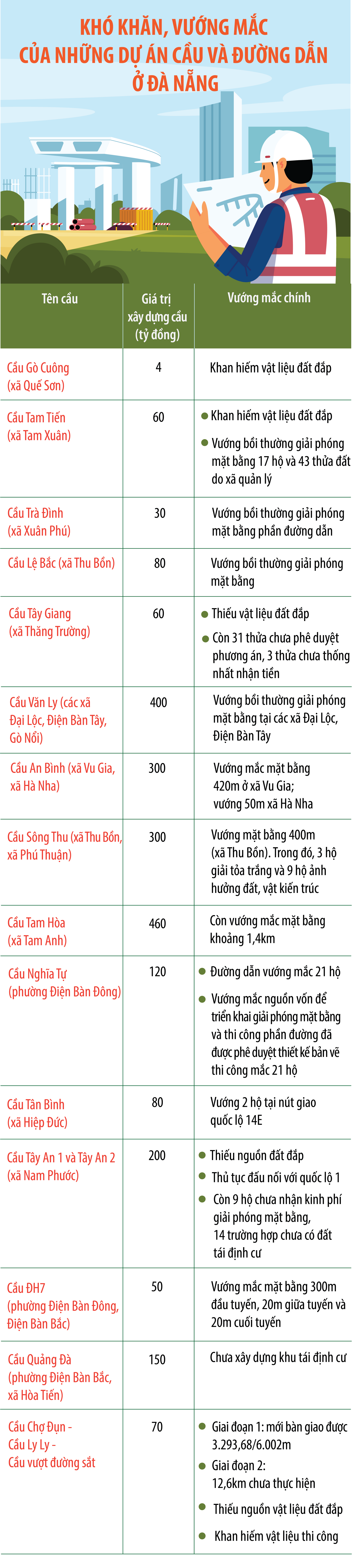 Theo chủ đầu tư, dự án cầu Tam Tiến còn gặp trắc trở do phải loay hoay tìm kiếm nguồn đất đắp đường dẫn lên cầu. Đến nay, nhà thầu thi công mới đạt khoảng 45% khối lượng hợp đồng.