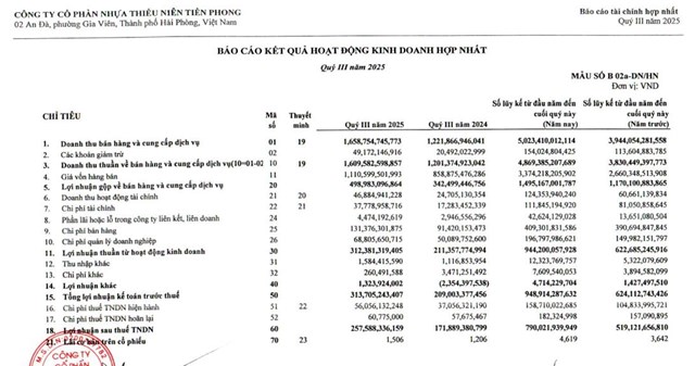 Về bức tranh tài chính, lũy kế 9 tháng đầu năm 2025, Nhựa Tiền Phong ghi nhận doanh thu đạt 4.869,3 tỷ đồng, tăng 27,1% so với cùng kỳ; lợi nhuận sau thuế đạt 790 tỷ đồng, tăng 52,2% so với cùng kỳ năm trước.