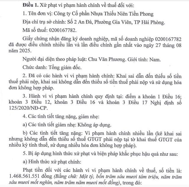 Theo đó, Nhựa Tiền Phong đã có hành vi khai sai dẫn đến thiếu số tiền thuế phải nộp, khai sai không dẫn đến thiếu số tiền thuế phải nộp và sử dụng hóa đơn không hợp pháp.