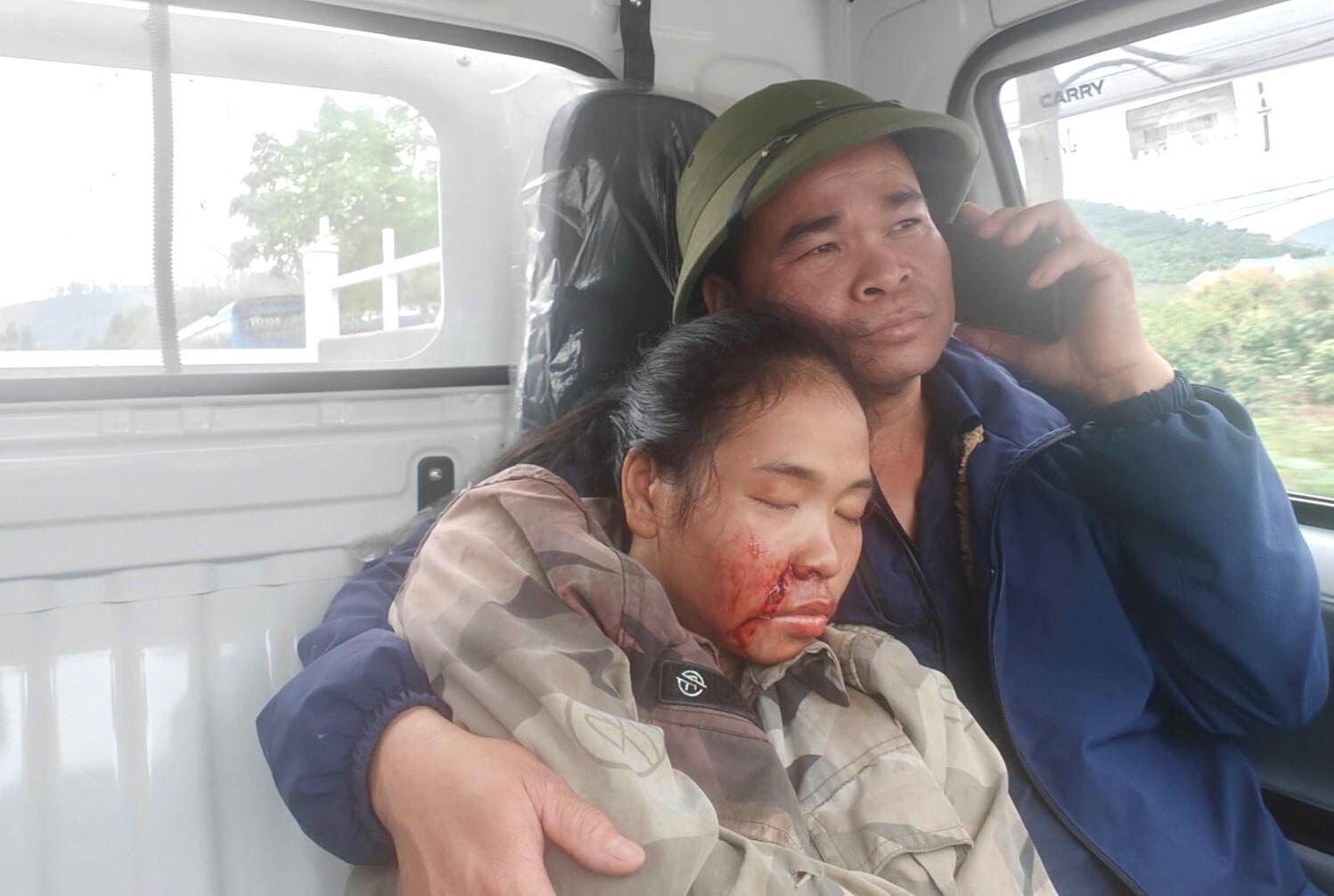 Chị Tơ Thị Bình bị thương trên xe công vụ của Công an xã Biển Động. (Ảnh: Công an Bắc Ninh).